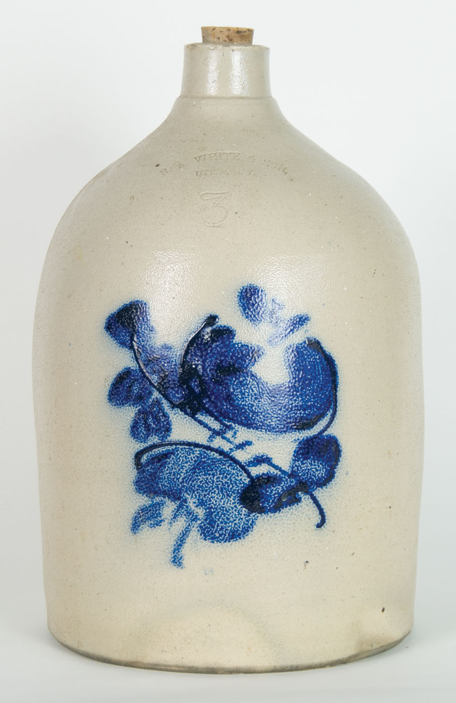 Cobalt decorations, one three-gallon pecking chicken, 11″ h, the other with floral decoration and marked “White's Utica”, 14″ h.
