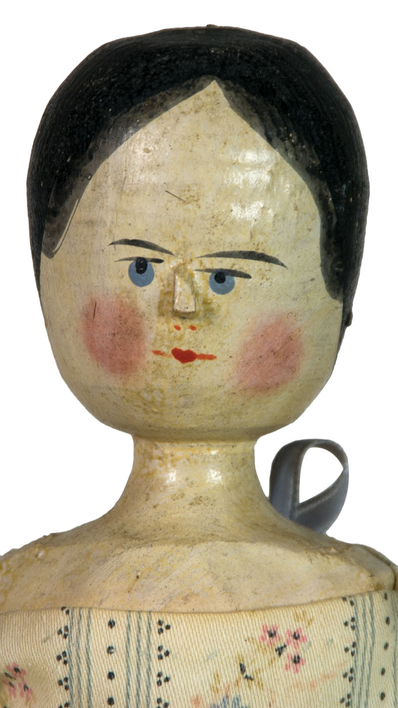 All-wooden construction with painted black hair, blue eyes, and other painted facial features, carved wooden nose, joining at shoulders and hips, painted red shoes, wearing original floral dress with lace trim, 14″ h, (ex. Dr. Oscar and Lois Hollander collection, Falmouth, MA).