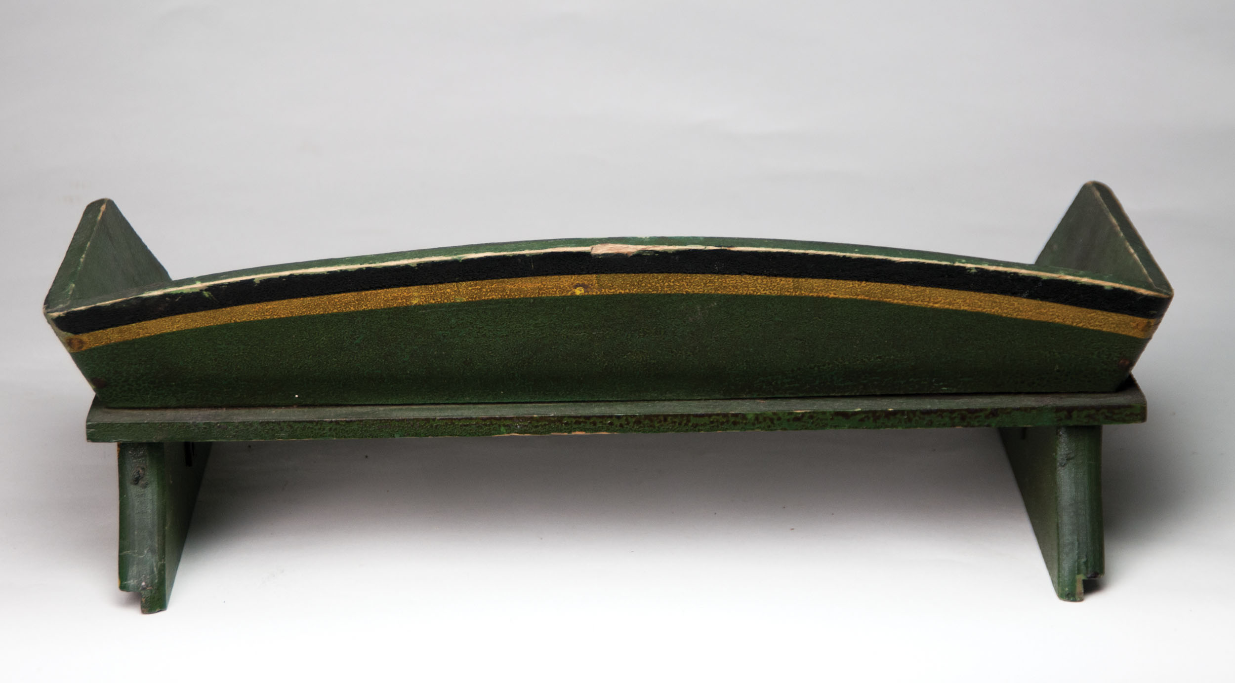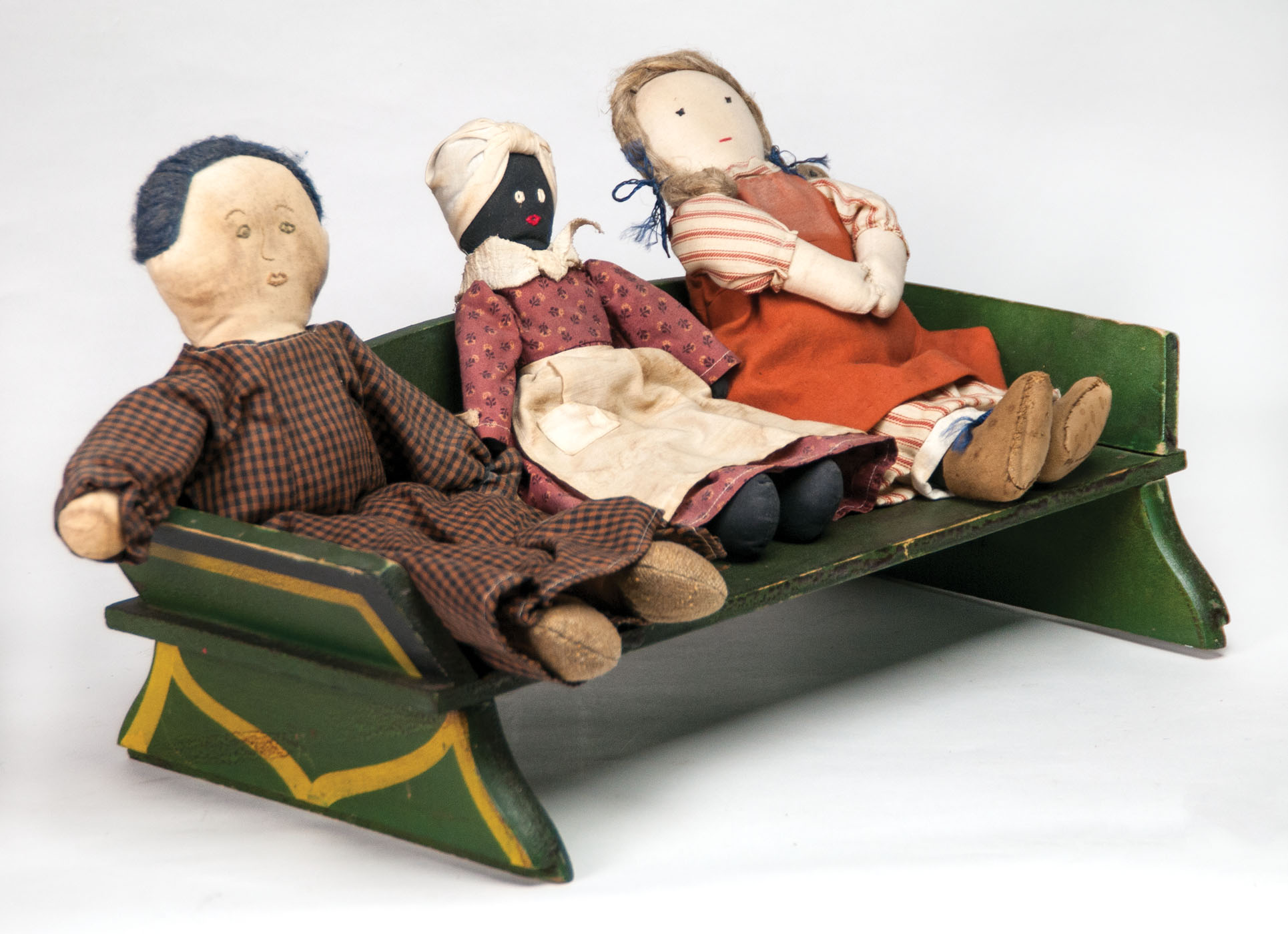 Victorian doll bed, original light blue and brown paint, carved finials, doll, teddy bear, and doll quilts, 20″ l, 13″ w; Pine doll buggy seat, original green paint with mustard yellow and black coach striping; Three cloth dolls, one with sewn facial features.