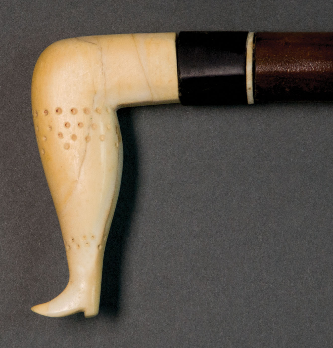 Whale's tooth “L” shaped handle, in the shape of a ladies leg, with punched decoration at calf and ankle, black baleen cuff and a whalebone ring above a tapered mahogany shaft, ending in a tapered 1 1/2″ bone ferrule, 34″ l, (ex. Dr. Oscar and Lois Hollander collection, Falmouth, MA).