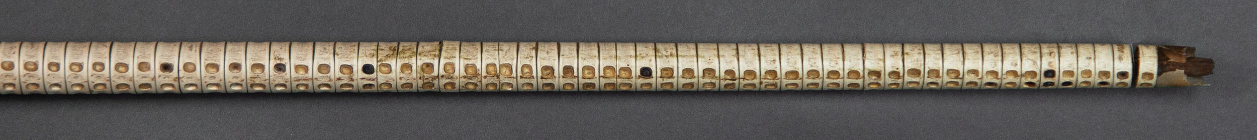 Tapered vertebrae cane with elk's horn top, four dark horn ring spacers at the top with horn ferrule at base (chipped), 35″ l, (ex. Dr. Oscar and Lois Hollander collection, Falmouth, MA).