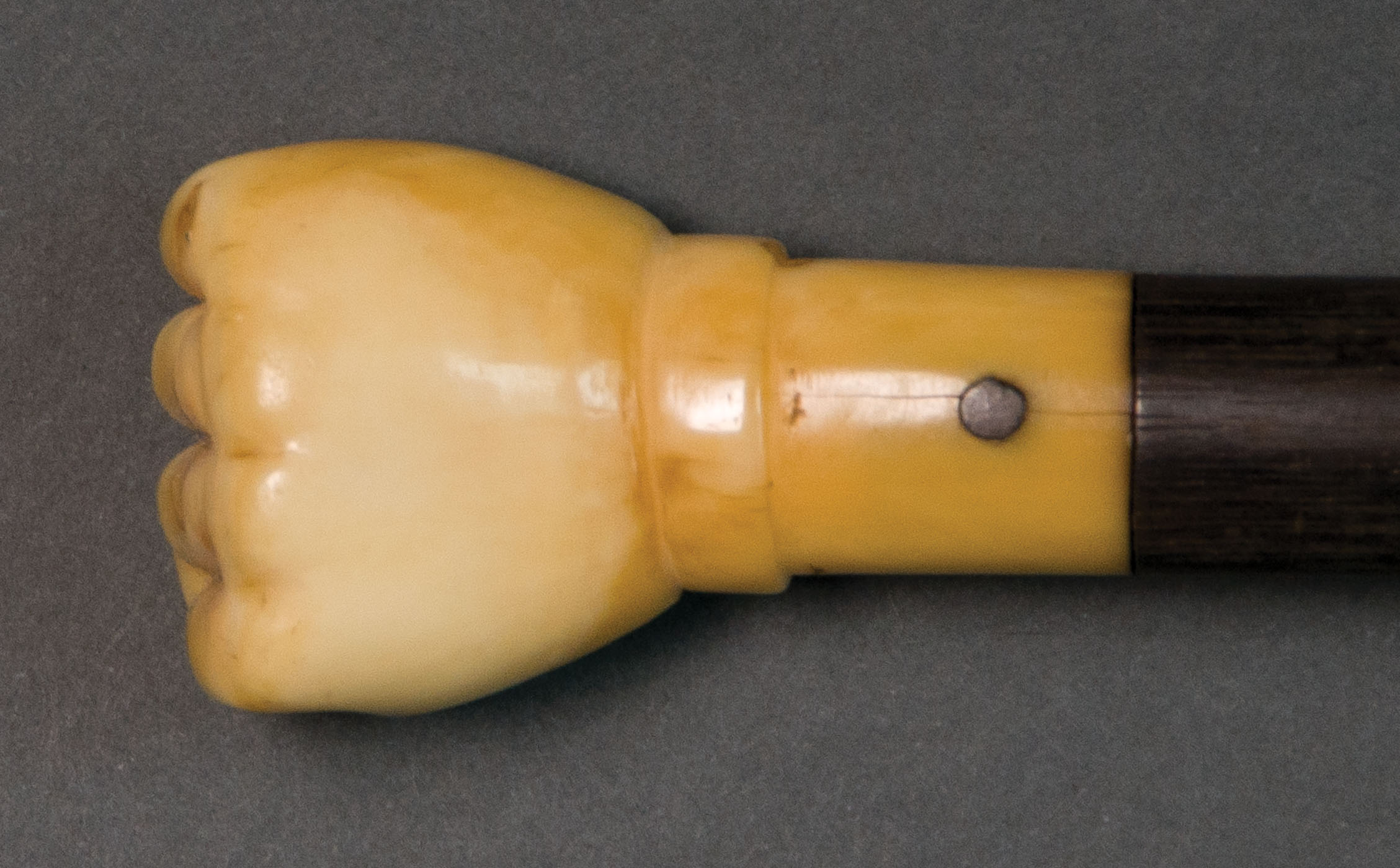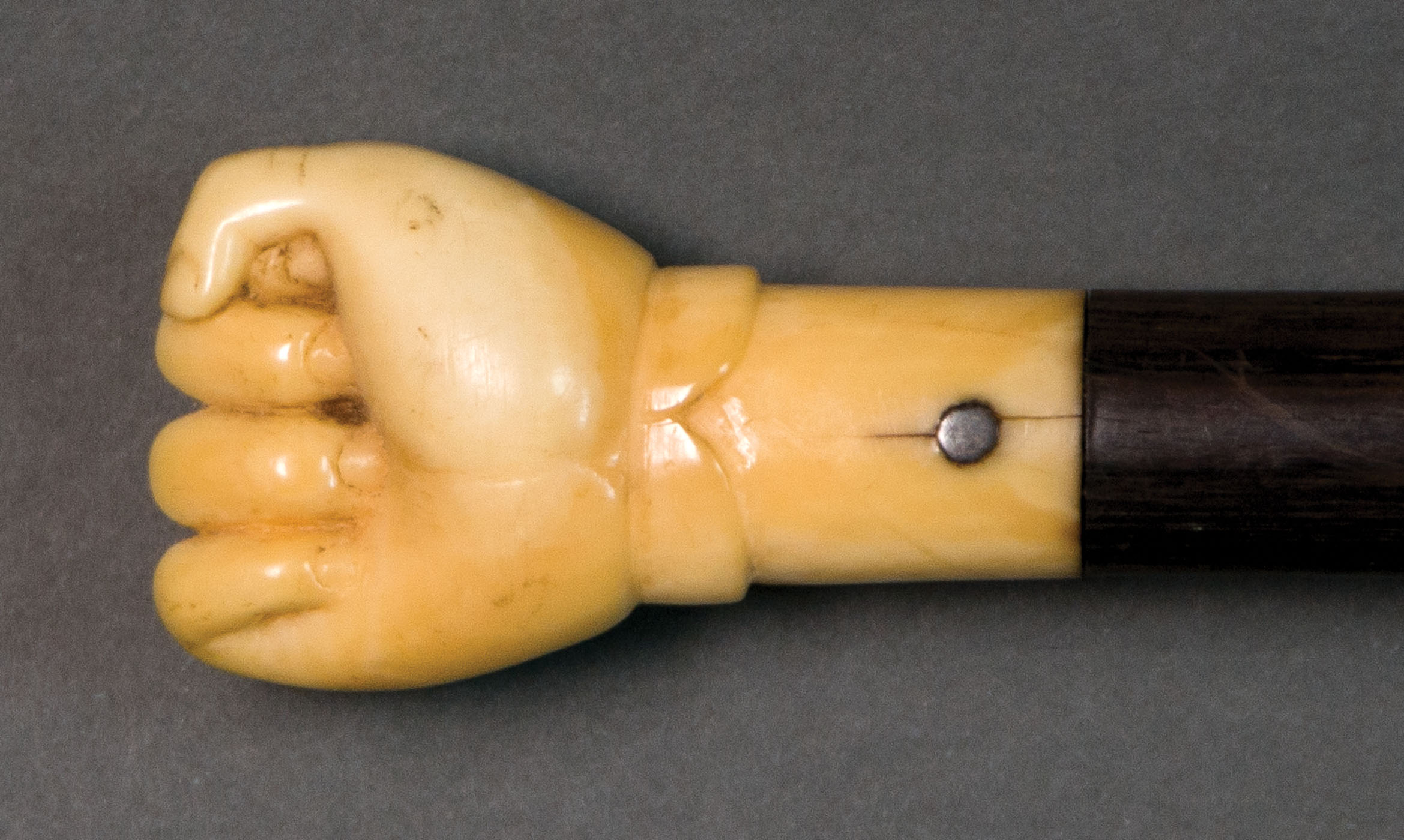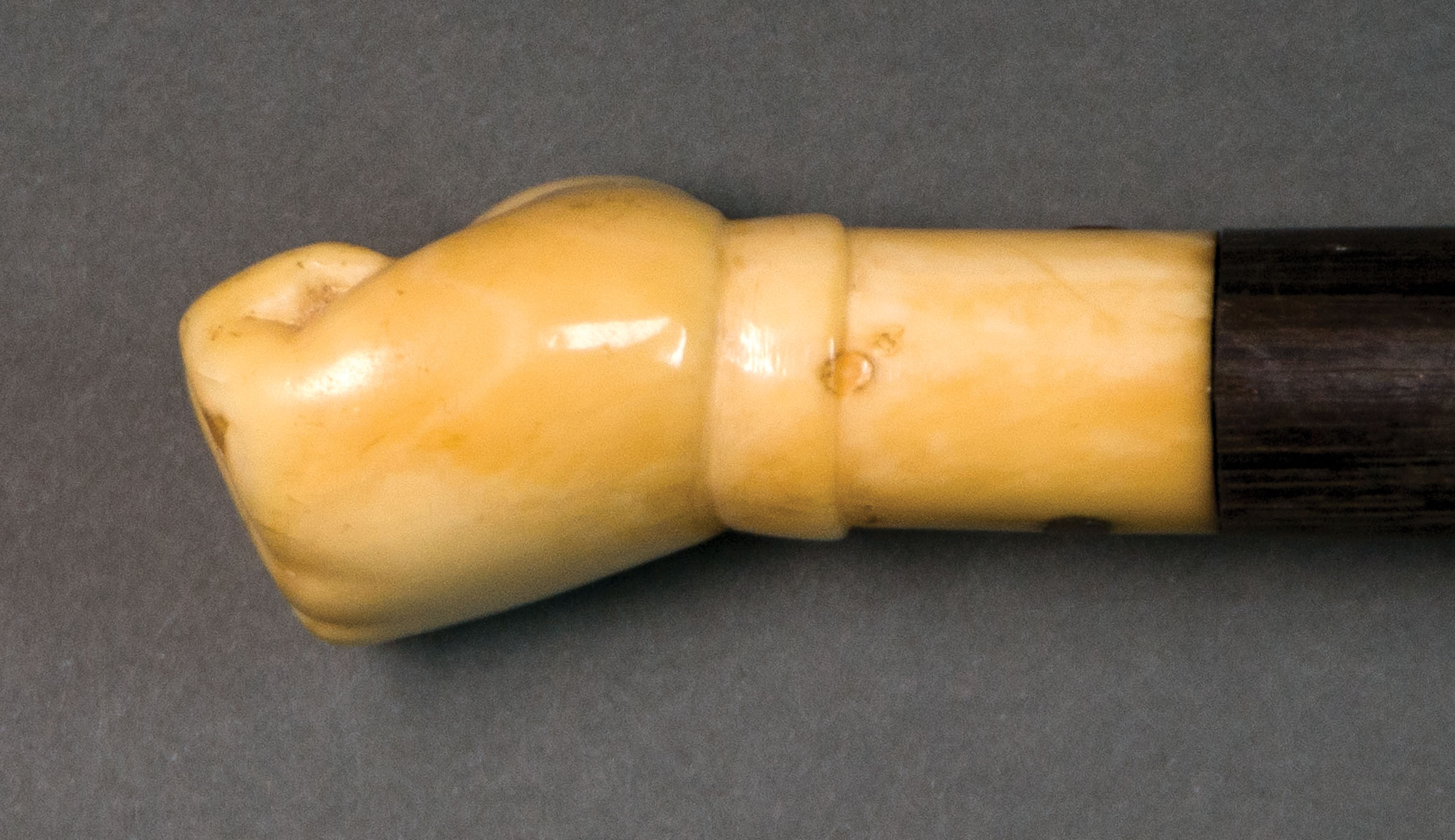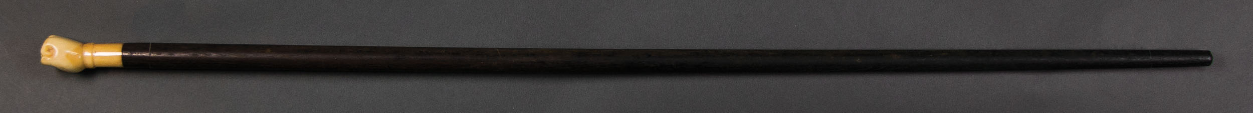 Whale tooth in the shape of a man's fist, with a shaped short cuff, attached to turned ebony shaft with silver pin, 33 1/2″ l, (ex. Dr. Oscar and Lois Hollander collection, Falmouth, MA).
