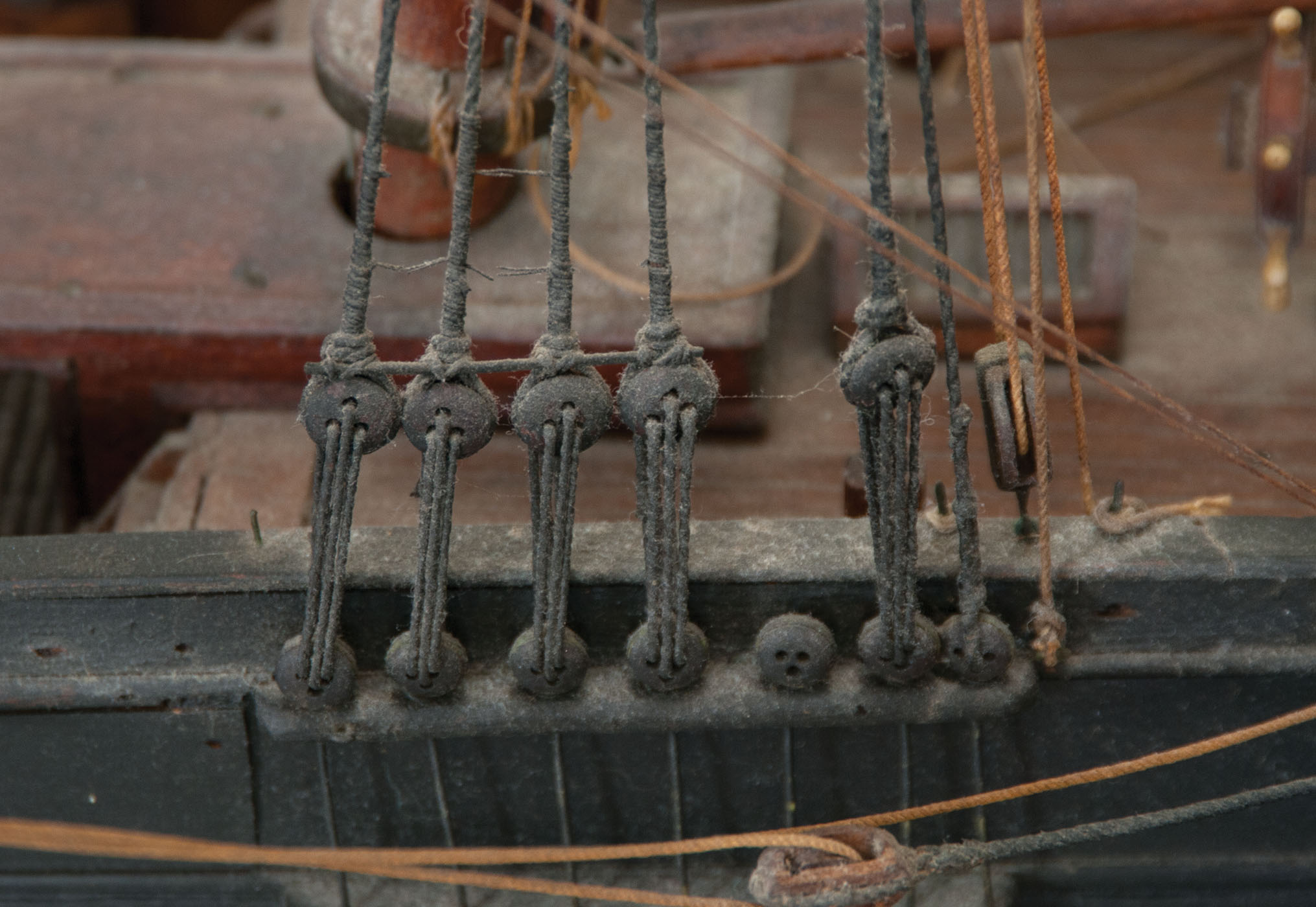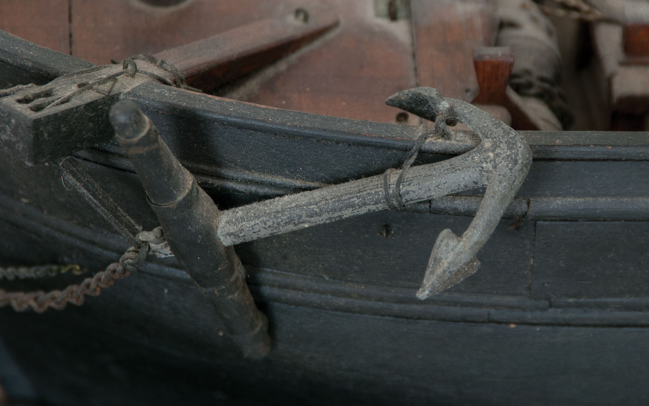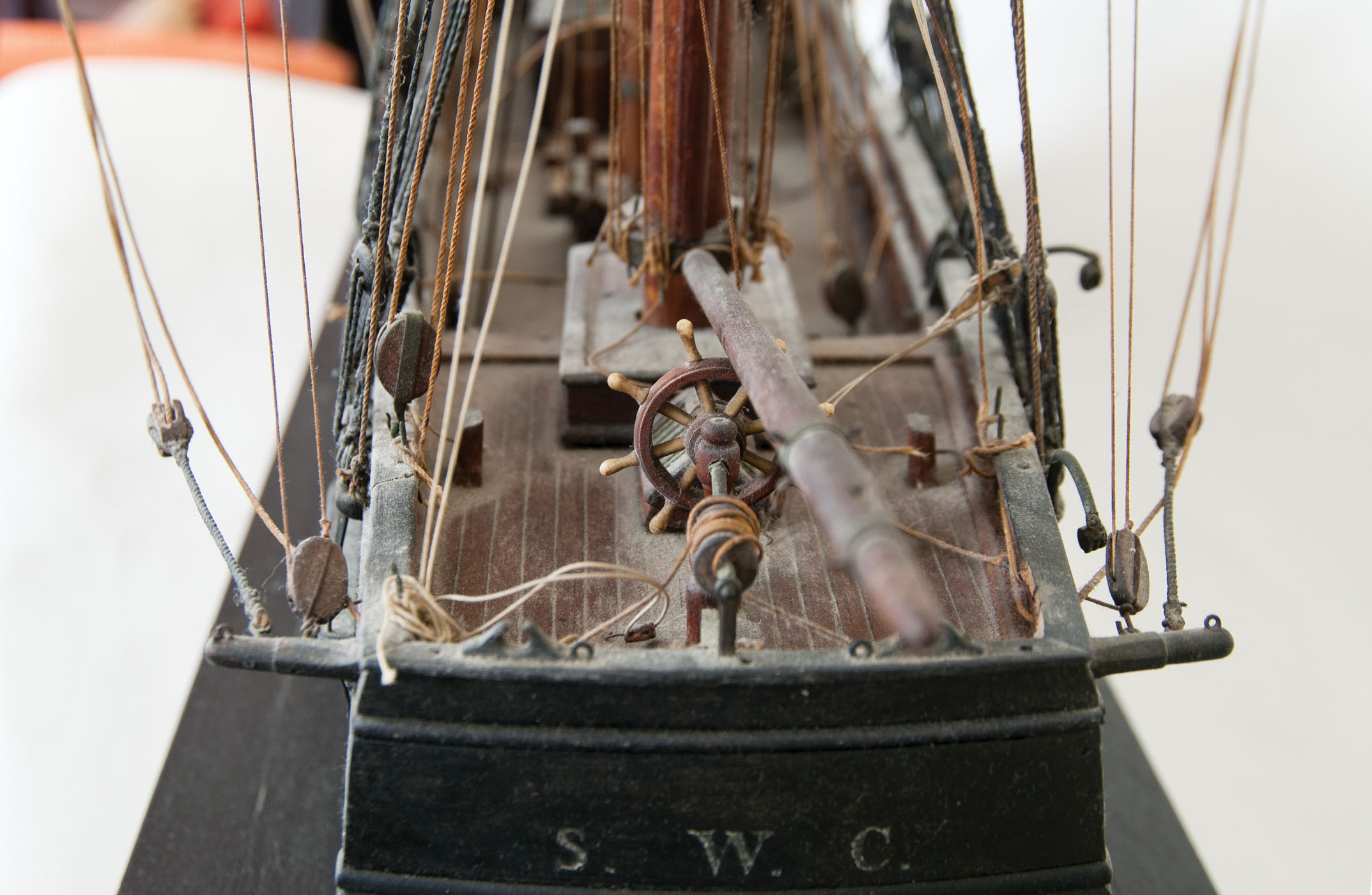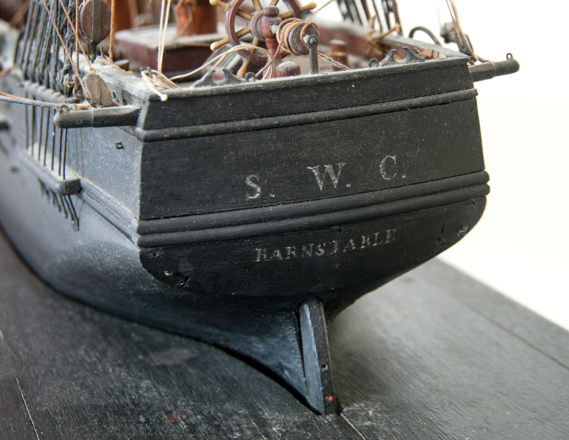 Exceptional ship model of the three-masted whaling ship, the “Barnstable”, intricately carved masts, spars, and detailed with anchors and chains, dory, carved pulleys and deadeyes, crows nest, painted black, some ropework needs restringing but almost all intact, fitted on a mahogany platform, ship measures approximately 33″ h, 50″ l, platform measures 3″ h, 41″ l, 10″ w, [The “Barnstable” was built in Boston in 1840 and was outfitted as a whaler, and sailed from New Bedford in May of 1851 (through August of 1855) under Captain Roswell M. Coon for the Pacific and Arctic, and very successfully sailed as a whaler through 1864, when it was sold to New York for Merchant Service.], (ex. Dr. Oscar and Lois Hollander collection, Falmouth, MA).