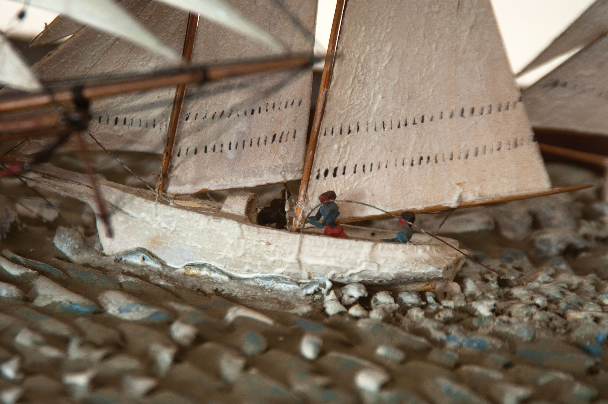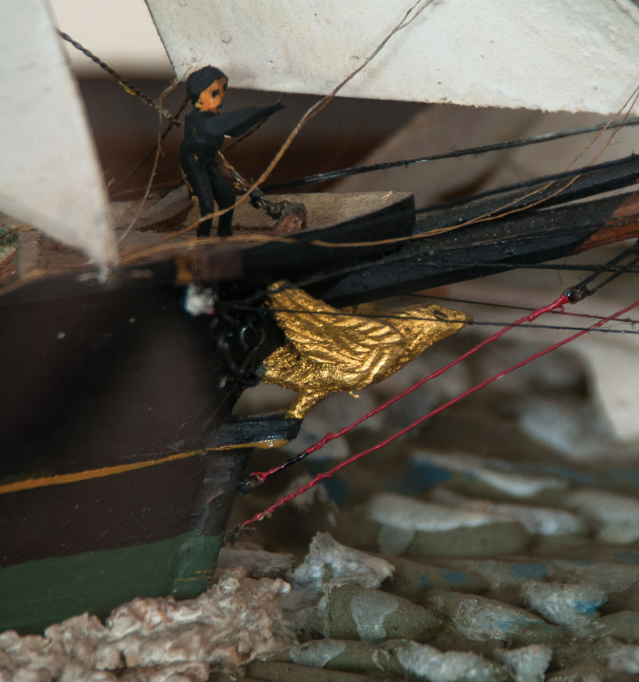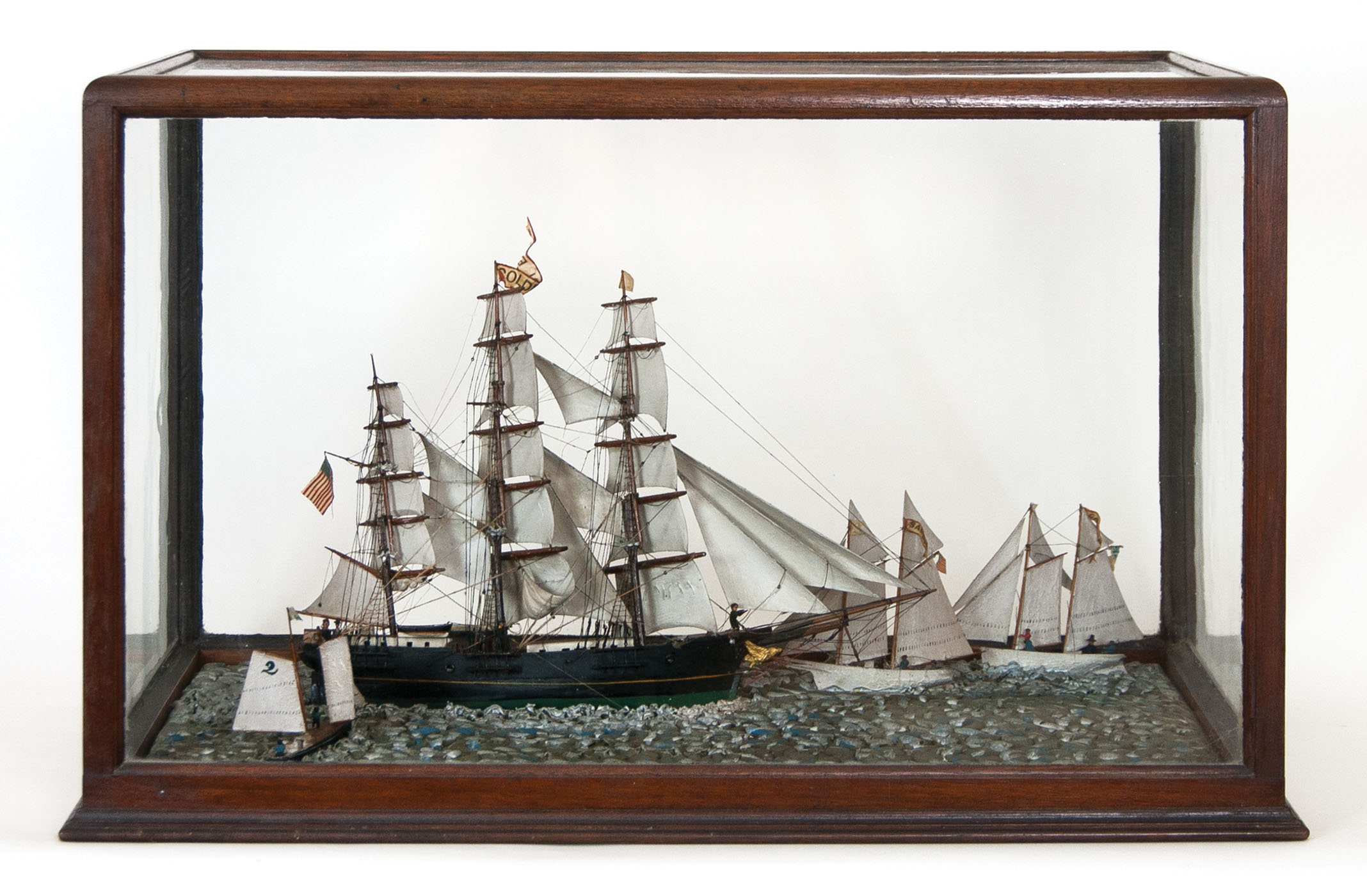 The “Golden Eagle”, in an original wood and glass case, surrounded by three small sailing vessels, see Greyhounds of the Sea, p. 271, 13″ h, 13″ w (ship), 16″ x 26″ x 15″ (case), [The yacht “Sappho” sailed out of the New York Yacht Club and was a defender at the 2nd America’s Cup Challenge. Owned by William Proctor Douglas and launched in 1867. Won the America’s Cup in 1871 (along with the Columbia). The Yacht Cambria raced out of the Royal Thames Yacht Club and was owned by James Lloyd Ashbury. Won the Great Ocean Race and the America’s Cup of 1870. The third vessel is a race boat with “#2” on its sails.], (ex. Dr. Oscar and Lois Hollander collection, Falmouth, MA).