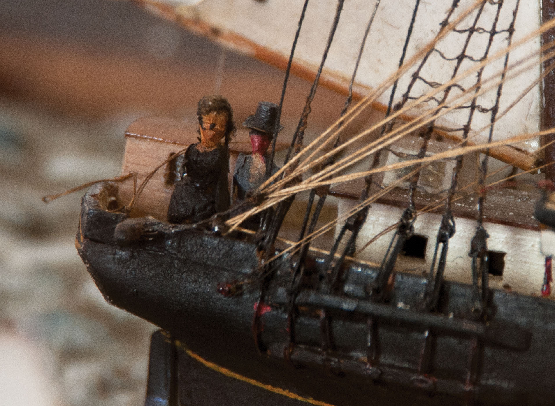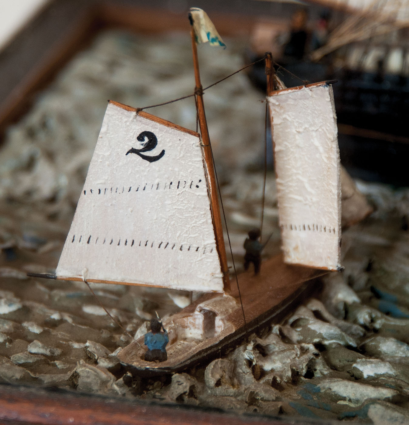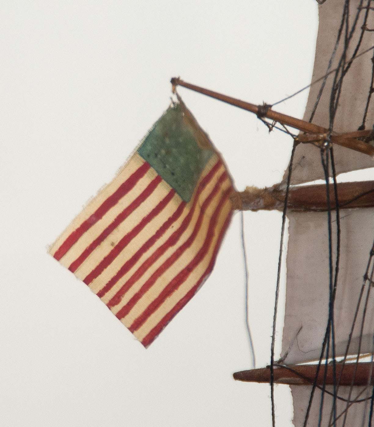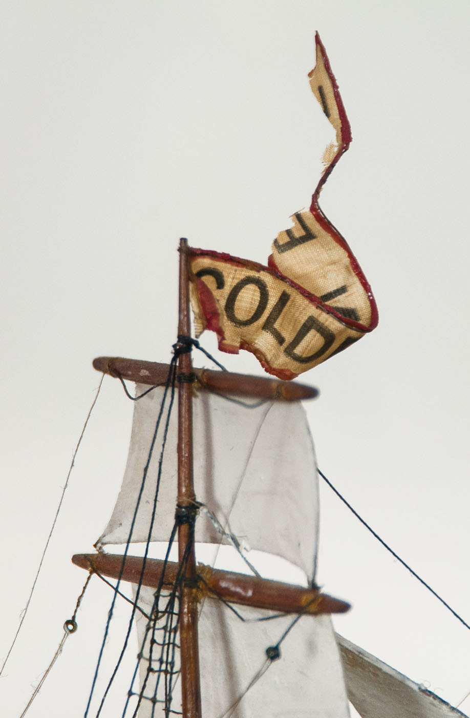 The “Golden Eagle”, in an original wood and glass case, surrounded by three small sailing vessels, see Greyhounds of the Sea, p. 271, 13″ h, 13″ w (ship), 16″ x 26″ x 15″ (case), [The yacht “Sappho” sailed out of the New York Yacht Club and was a defender at the 2nd America’s Cup Challenge. Owned by William Proctor Douglas and launched in 1867. Won the America’s Cup in 1871 (along with the Columbia). The Yacht Cambria raced out of the Royal Thames Yacht Club and was owned by James Lloyd Ashbury. Won the Great Ocean Race and the America’s Cup of 1870. The third vessel is a race boat with “#2” on its sails.], (ex. Dr. Oscar and Lois Hollander collection, Falmouth, MA).