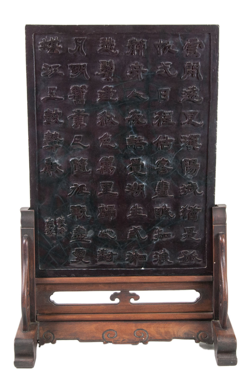 Intricately carved or molded raw material, showing scenes of elders and scholars crossing a bridge, and playing a board game, within a dense foliage background, and on the reverse carved Kaishu script describing the scene, slides into a hand-carved base, 20 1/4″ h, 13 1/2″ w (stand), 15 1/2″ h, 11 3/8″ w (screen).