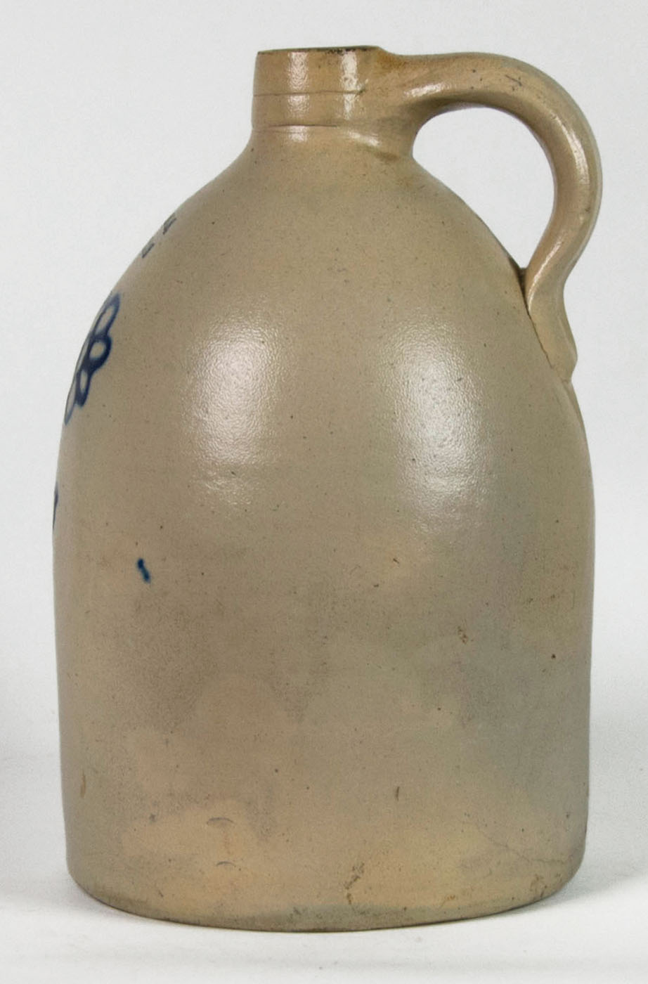 Two-gallon, with cobalt blooming daisy, stamped “F.B. Norton Sons, Worcester Mass”, previously electrified with plugged hole south of handle at the base, otherwise good condition, 14 1/4″ h, (ex. Ed Clerk collection).