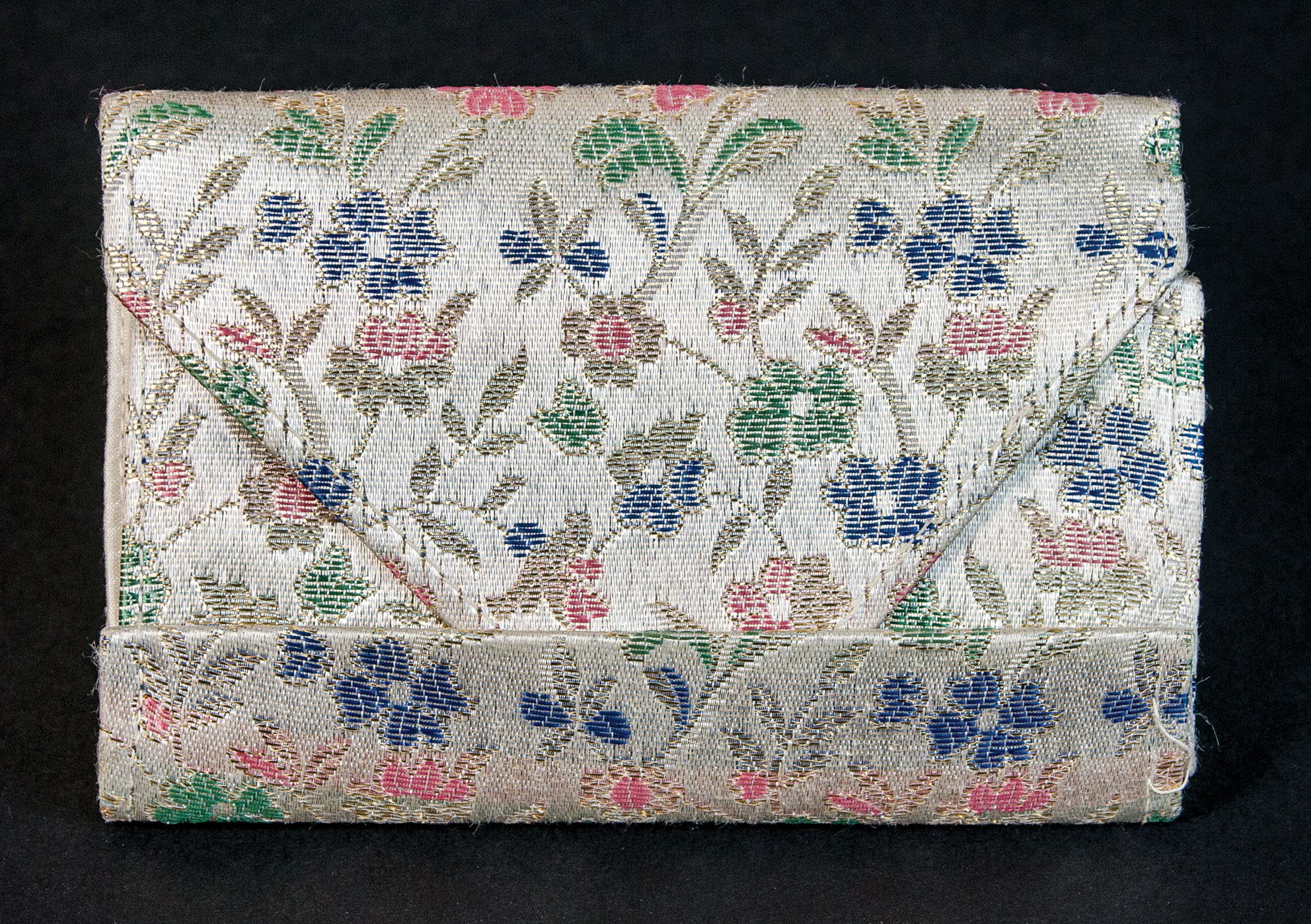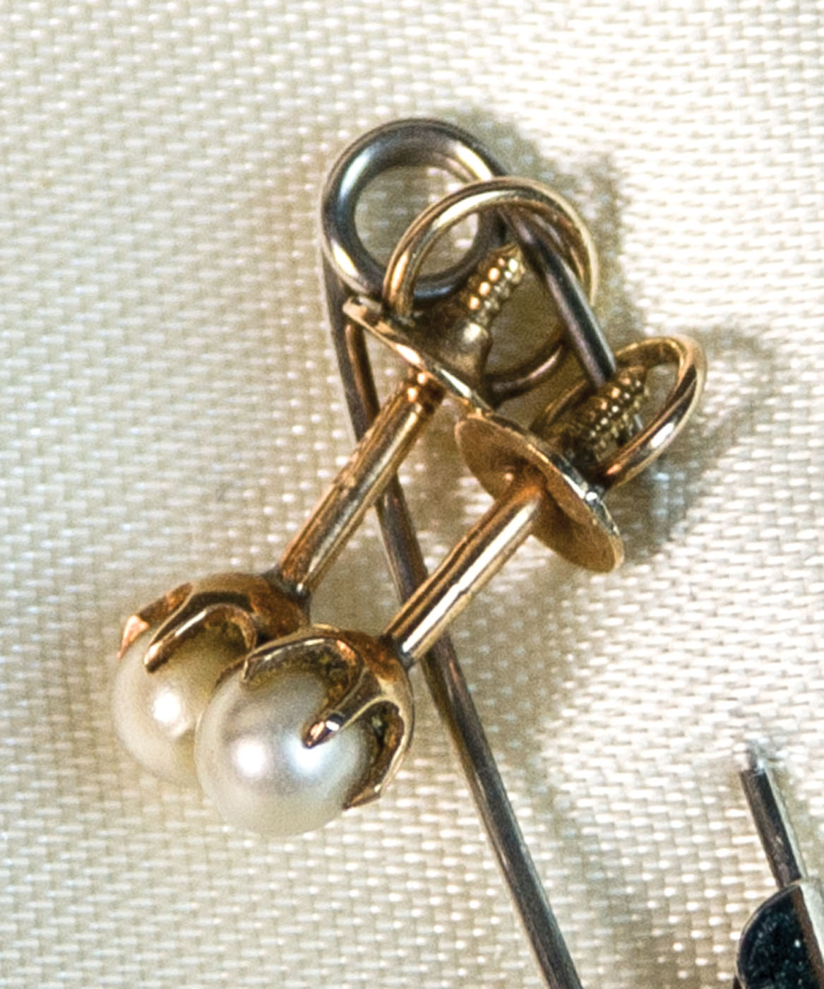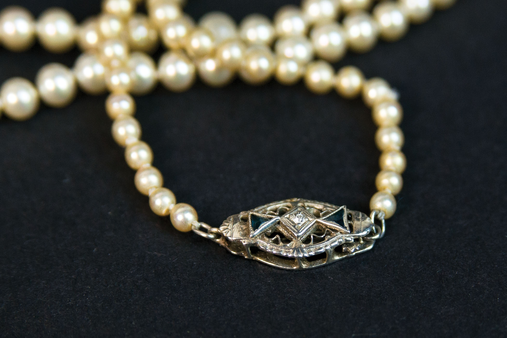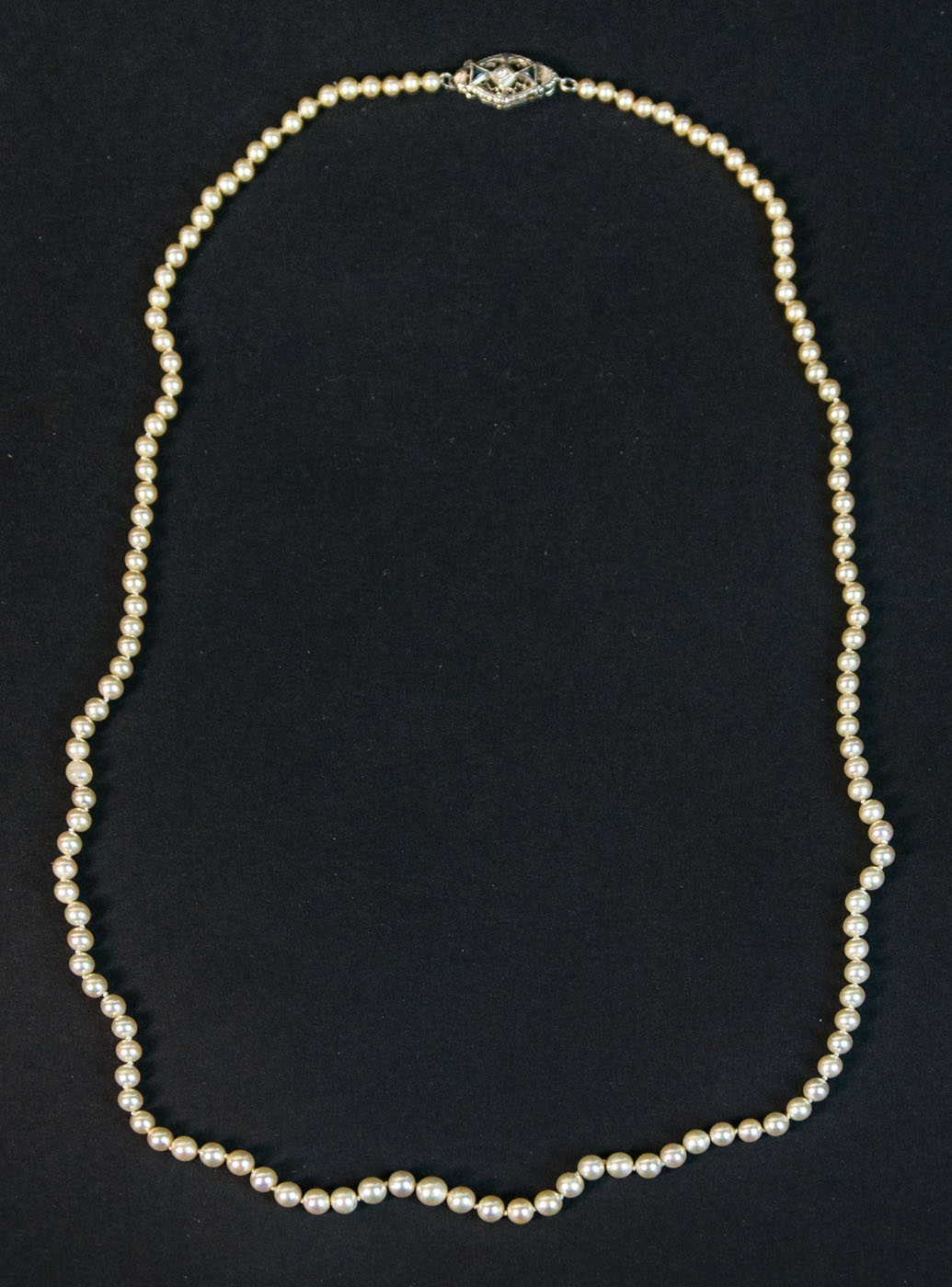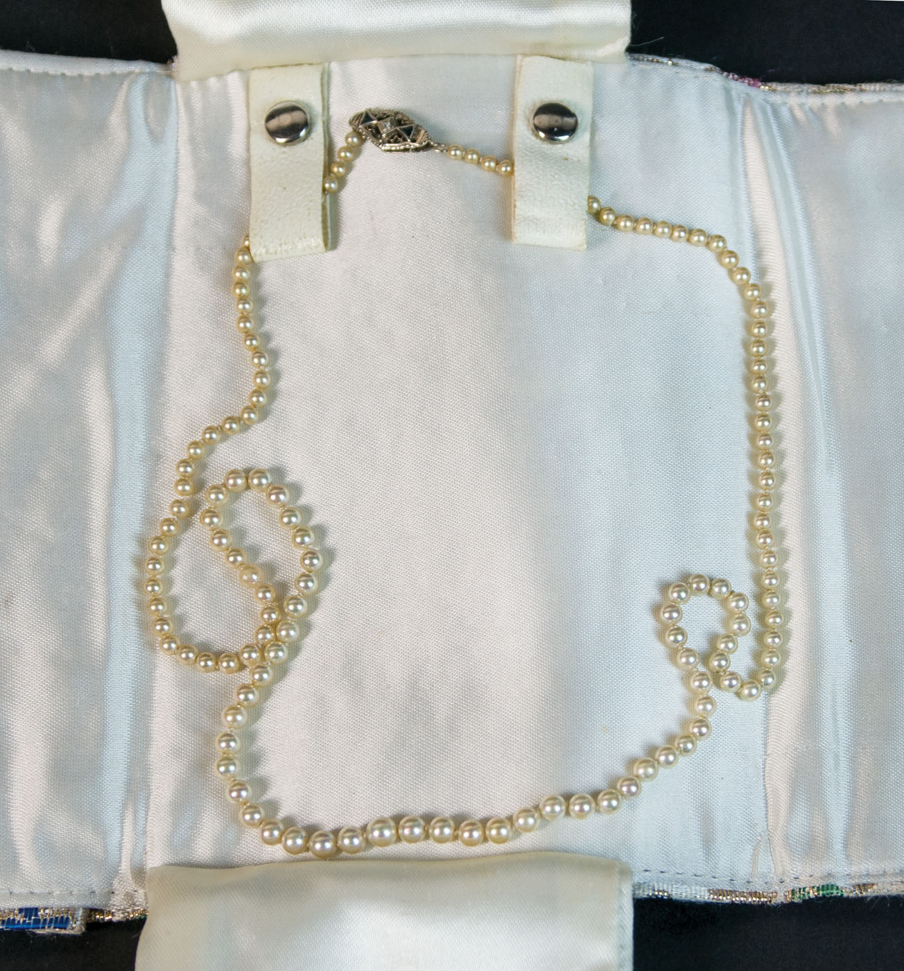 Old string of baby pearls, graduated, deco clasp with diamond and triangular gems on either side, 18 1/2″ l; Pair of pierced earrings with baby pearls; includes embroidered cloth case.