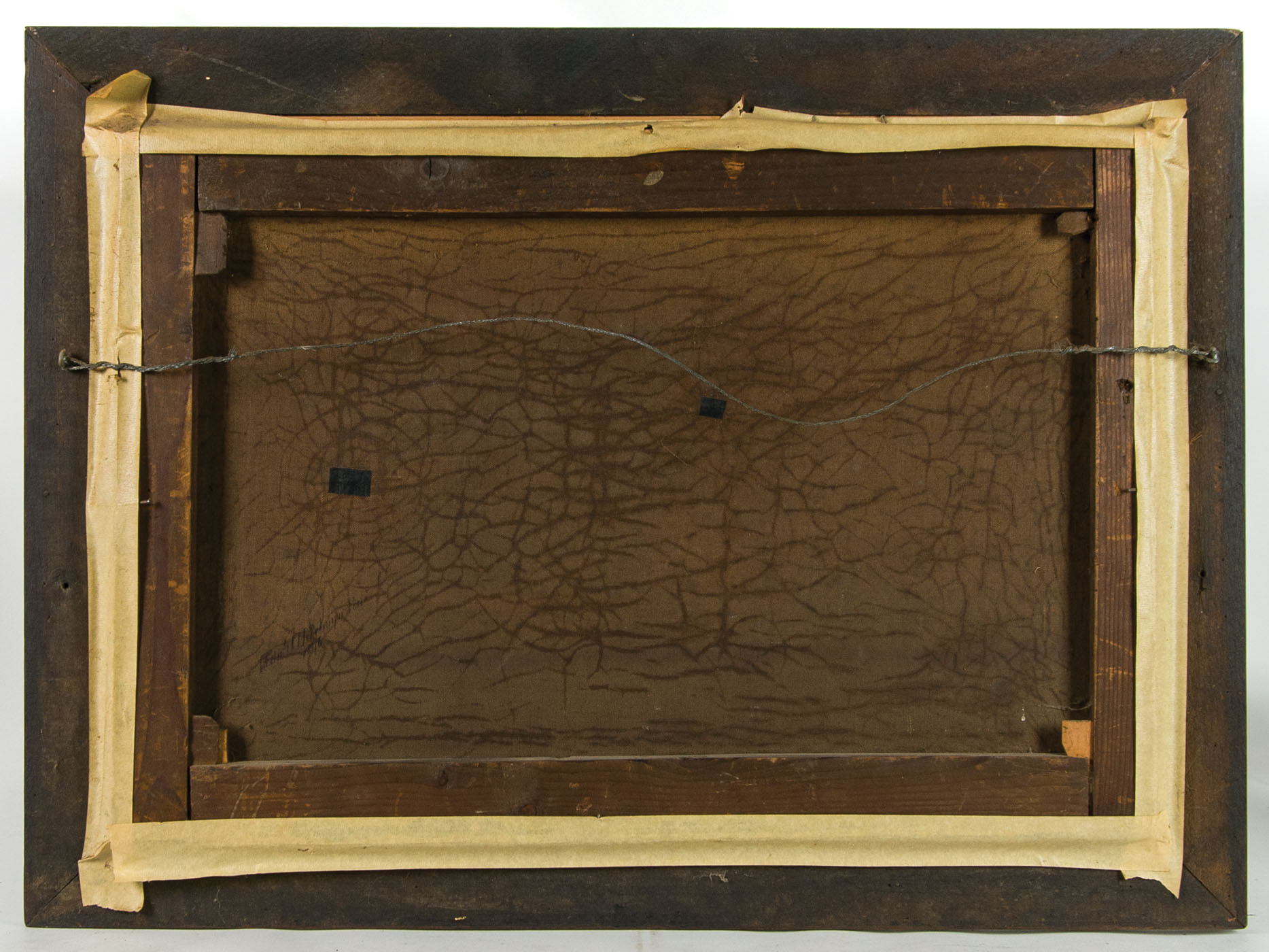 Oil on canvas of Naval ships on a green sea, signed on reverse in ink “Adm J. H. Selwyn Pinxt 1876″, two very small patches around ship in the foreground, craquelure throughout, period walnut frame with gilt liner, from the Roche family of Norwell, MA, 17″ x 24” (sight).