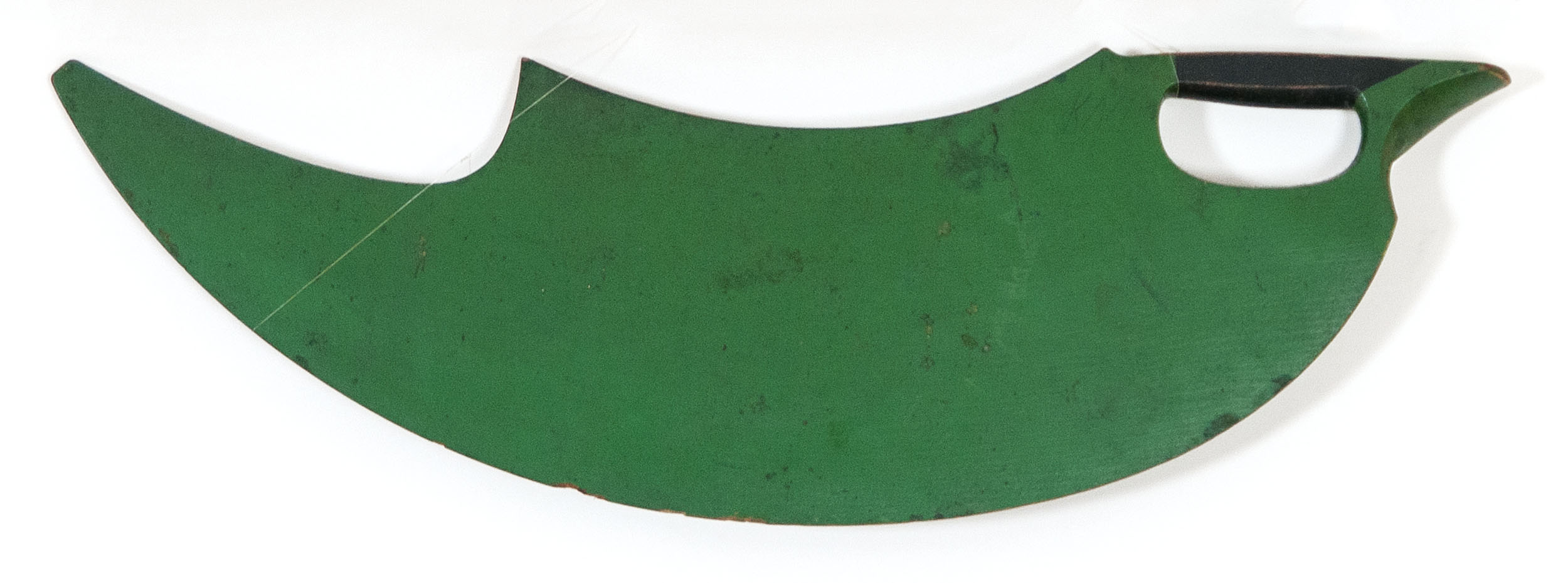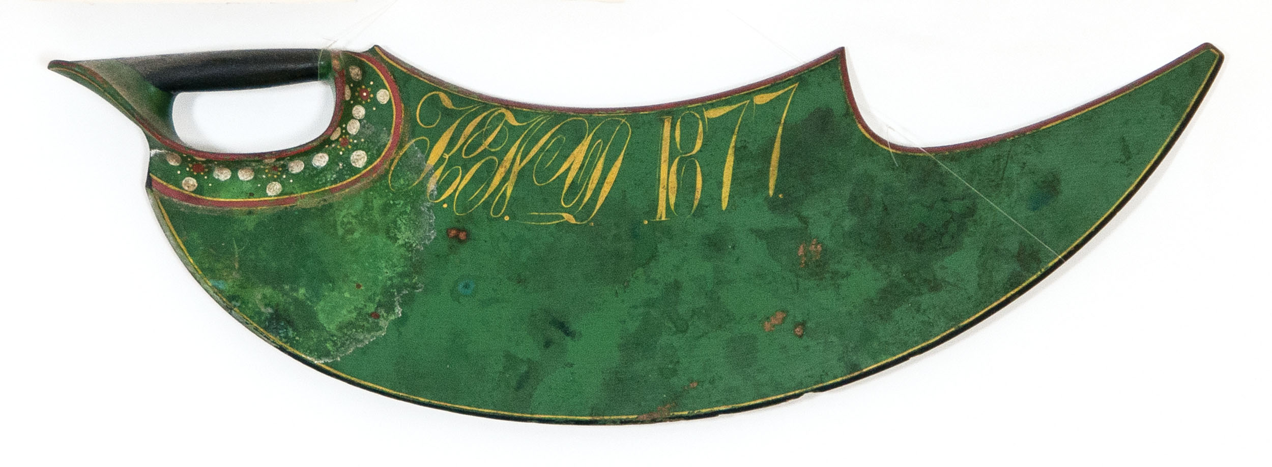 Carved from one piece of wood, painted, with handle, green painted background with gold initials, and dated “1877”, white and red dots surround handle, found in the Templeton estate in Woods Hole, MA formed primarily in Pennsylvania, 23 1/2″ l, 7″ w, (ex. Dr. Oscar and Lois Hollander collection, Falmouth, MA).