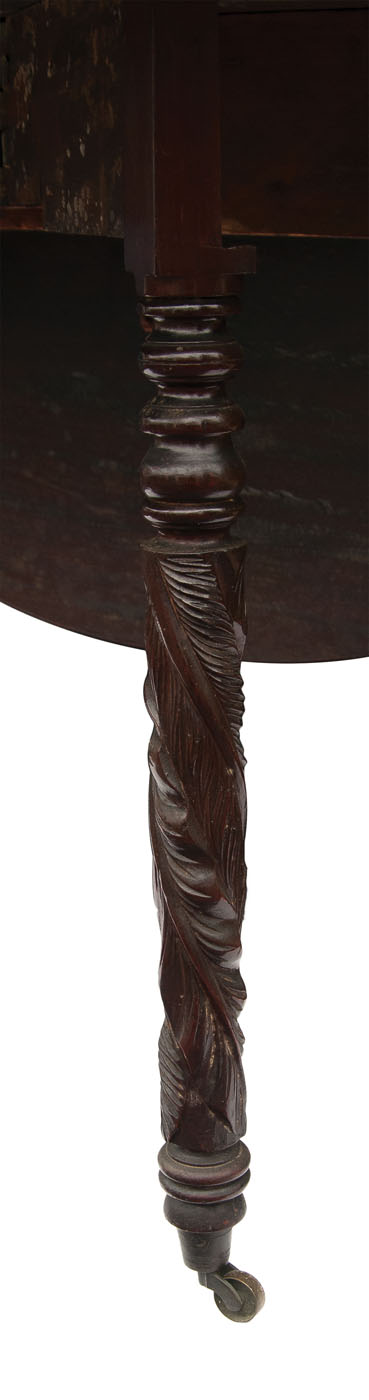 Mahogany, drop leaf dining table, deep drop rounded leaves, acanthus carved, six-leg, swing leg on original brass castors, c. 1810-1830, from the Roche family of Norwell, MA, 28 1/2″ h, 46 1/2″ l, 19″ (leaf).