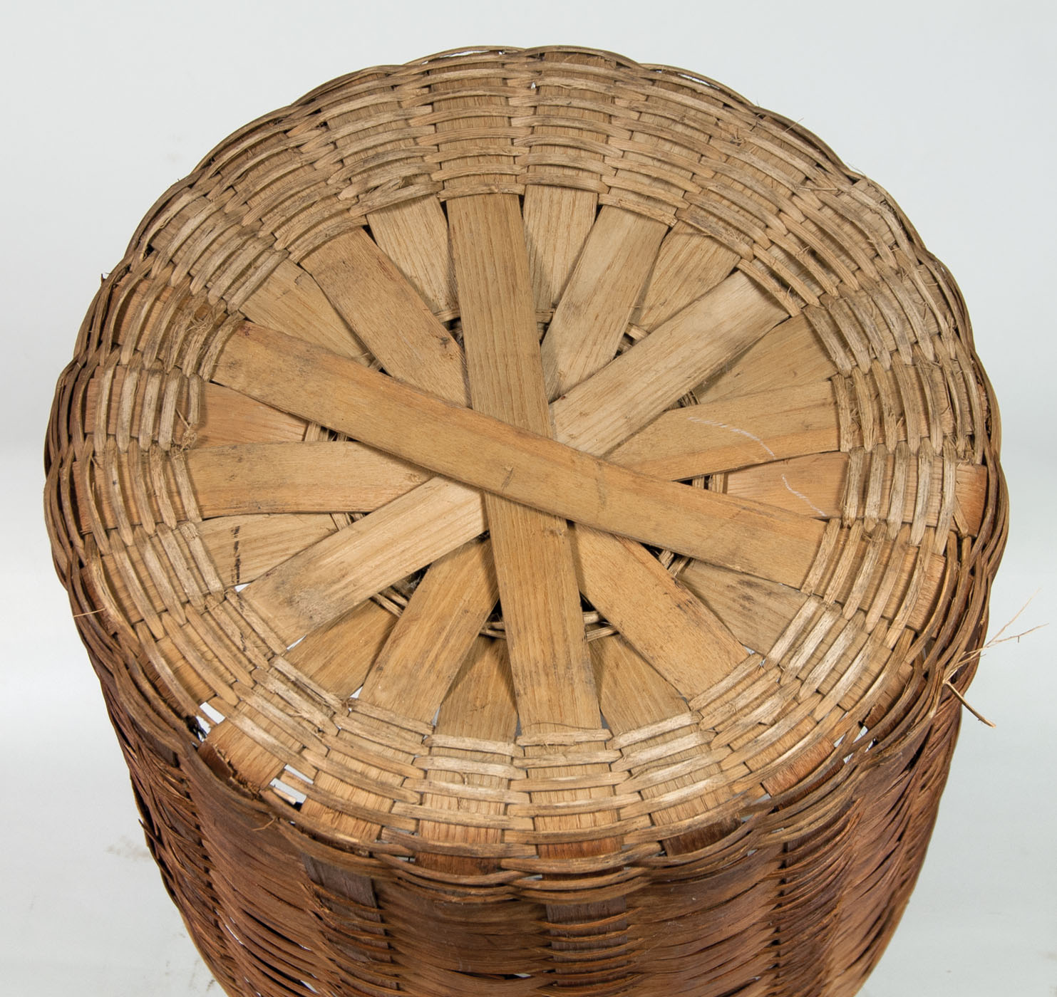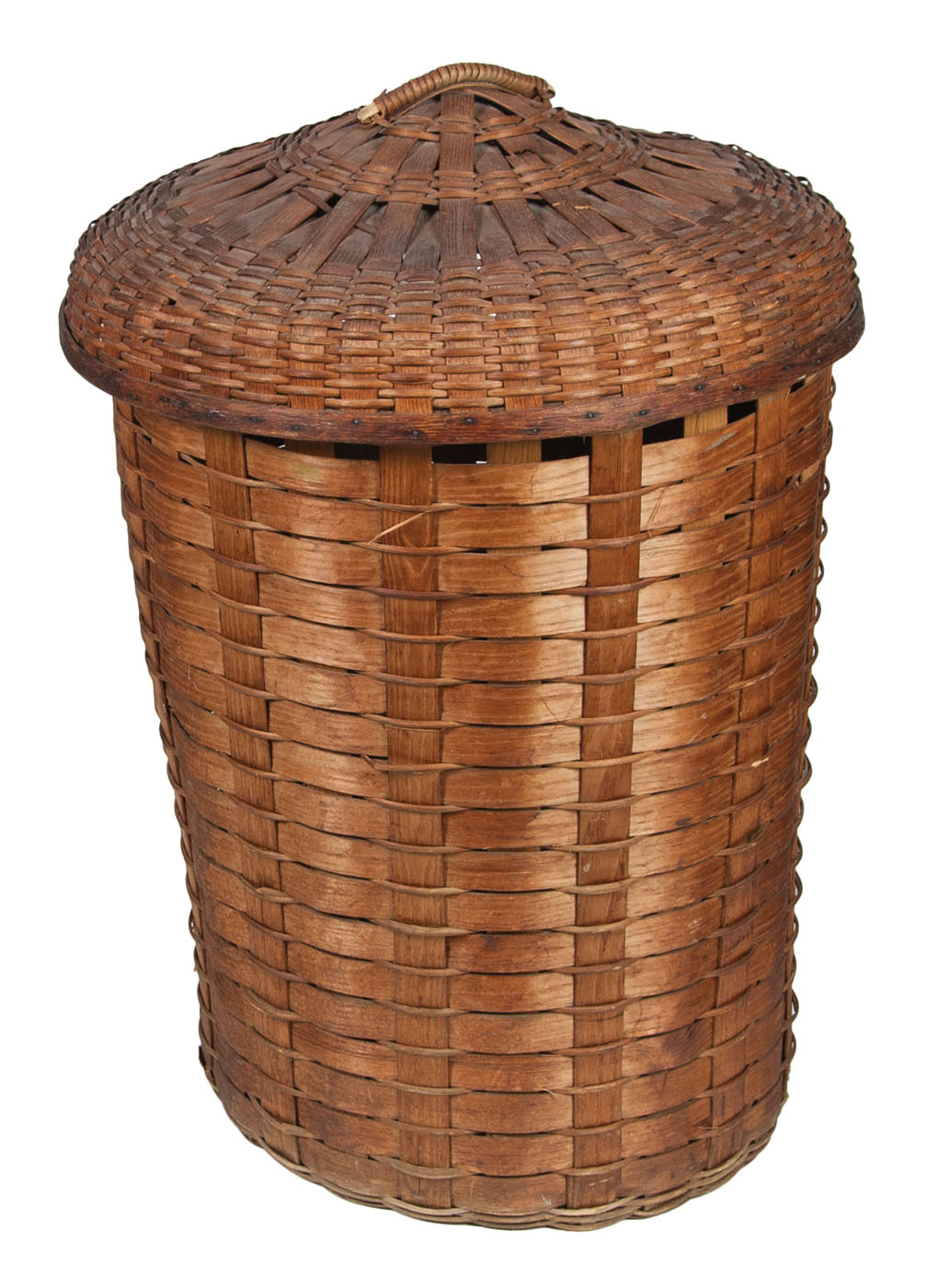 Black ash and oak woven splint, conicle handled lid, some breaks and imperfections, but overall good condition, found on the North Shore of Massachusetts, 33″ h, 24″ dia.