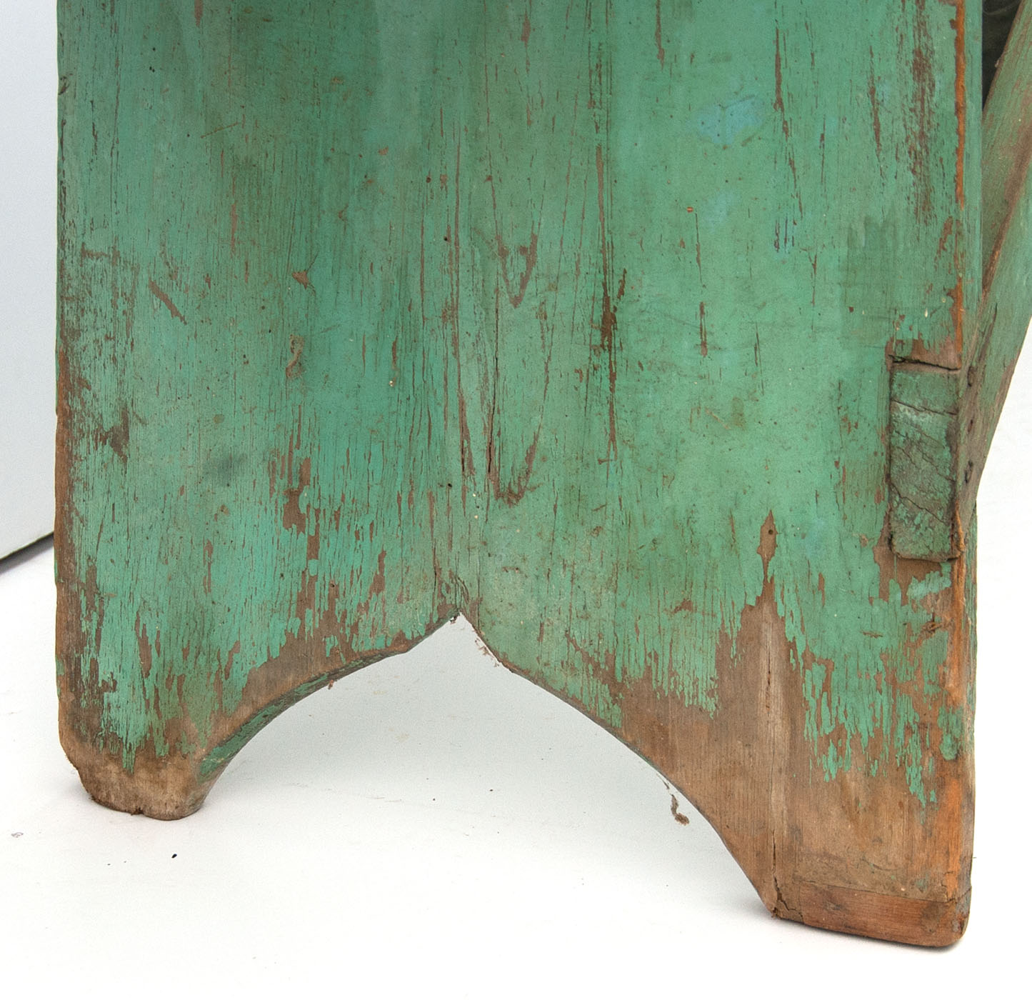 Pine, in original worn aqua blue painted finish, two canted supports with bootjack ends, through mortised through the top, two diagonal back supports, small old inset repair on one back corner, 23 1/2″ h, 88″ l, 13 1/4″ d, (ex. Ed Clerk collection).
