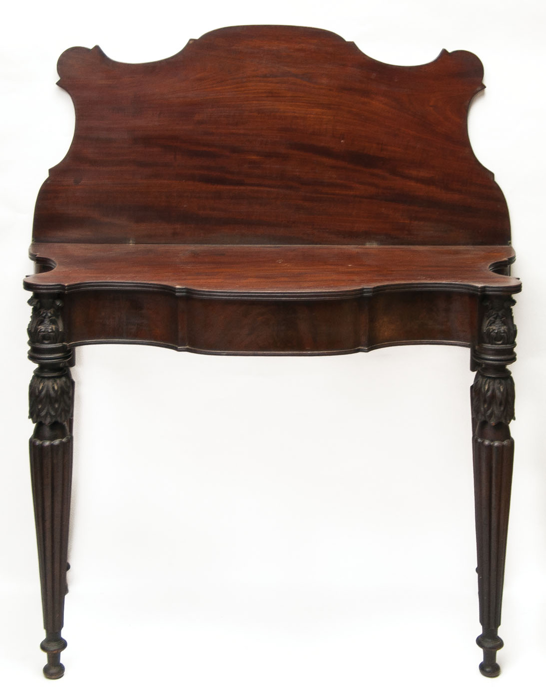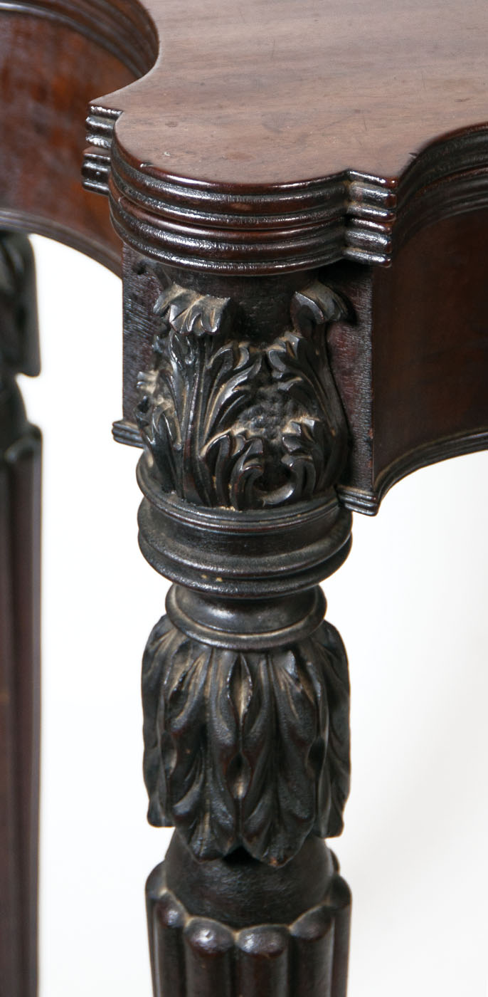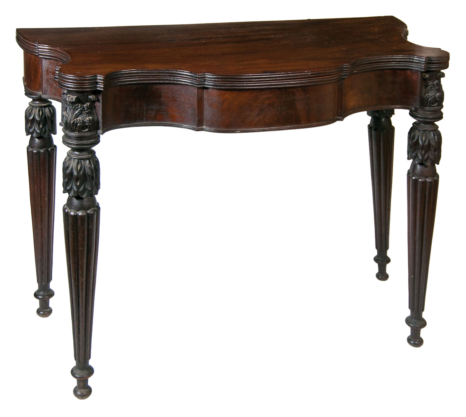 Exceptional New England Federal card table, mahogany, serpentine front, in original finish, school of the renowned McIntire family, cabinetmakers of Salem, Massachusetts, c. 1820, with deeply cut and molded overhanging top, on a conforming scrolled serpentine skirt, on wonderful acanthus carved, turned, tapered and reeded legs, terminating on ball feet, from a Cohasset, MA estate.