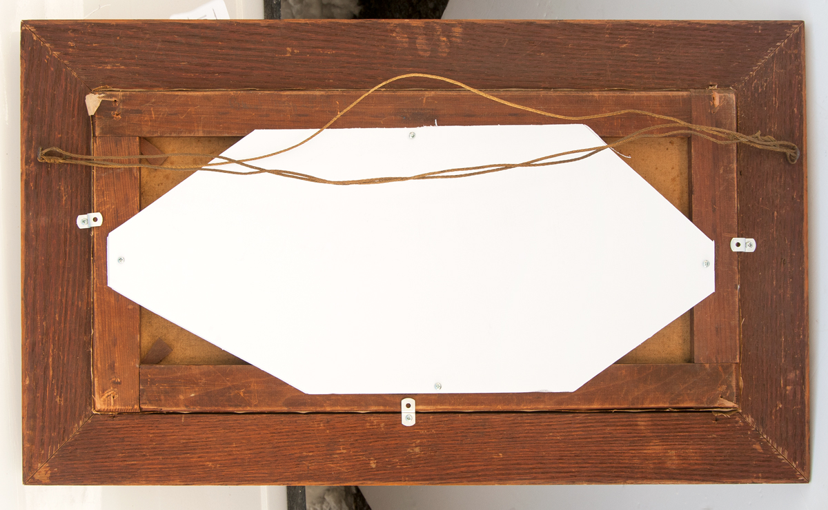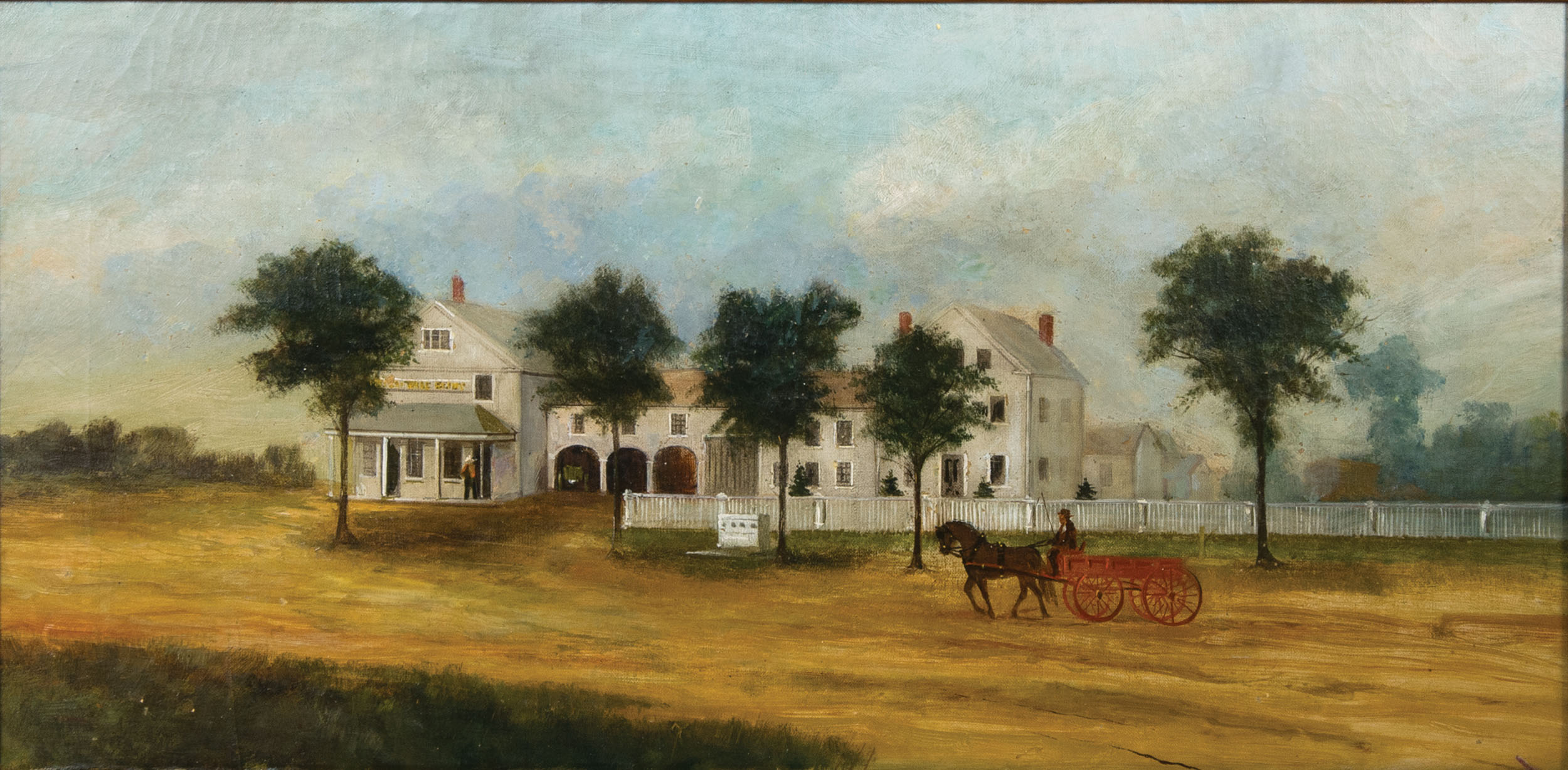 Country store with sign “Wise Store”, attached to a colonial home, horse and red wagon on a dirt road in front of fence, signed on stretcher “B. Hunt, May 23, 1884″, original carved wood and plaster frame, possibly a Brockton, MA store, 12″ x 24” (sight).