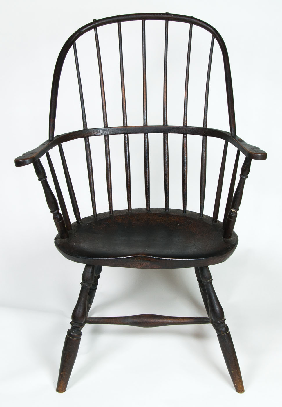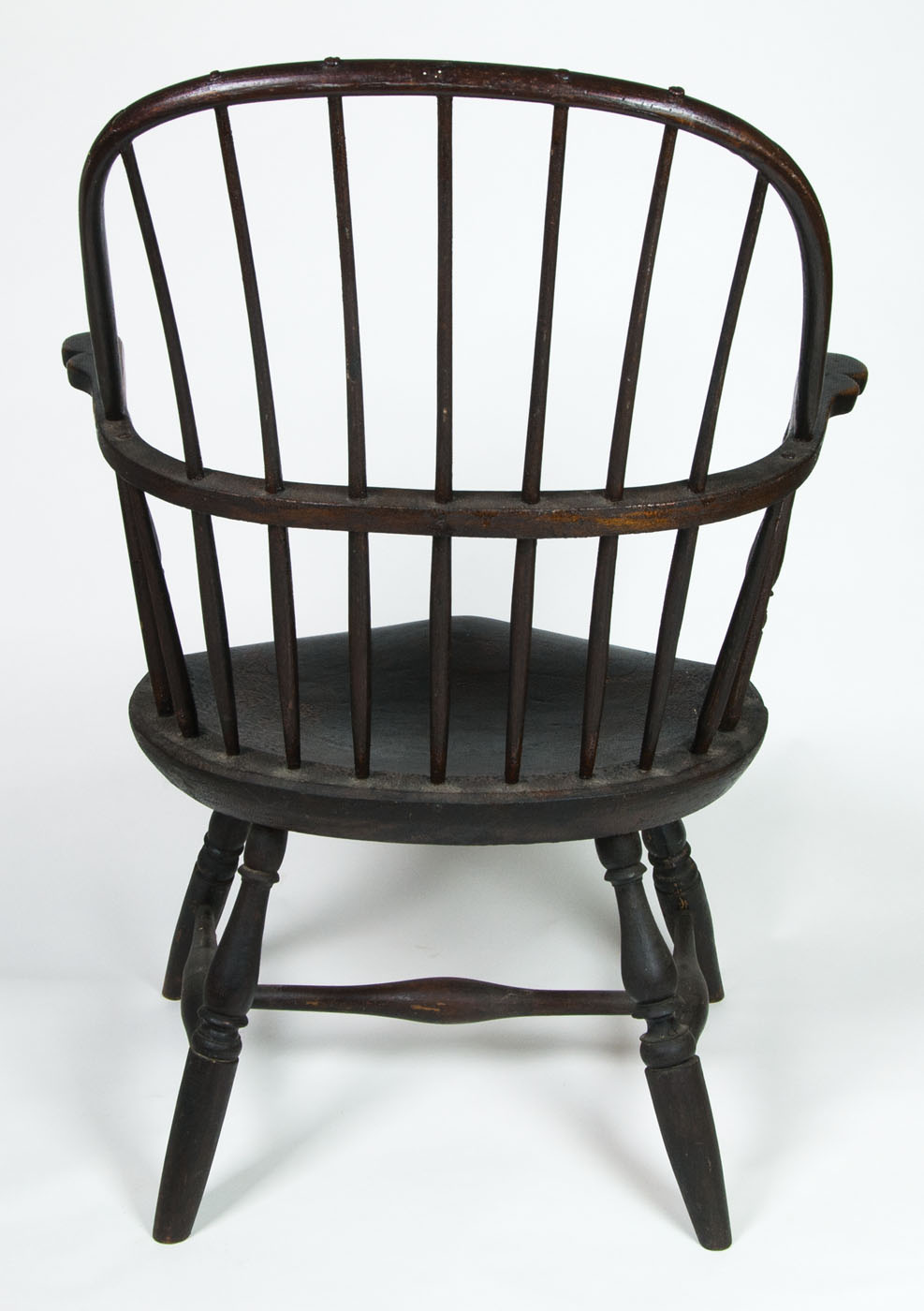 Pine and hickory, old black paint, hoop back, paddle arm, alligatored throughout, saddle seat, “H” stretcher with nicely turned ring and vase legs, from a prominent family in Duxbury, MA, 16″ seat h, 38 1/2″ overall h.