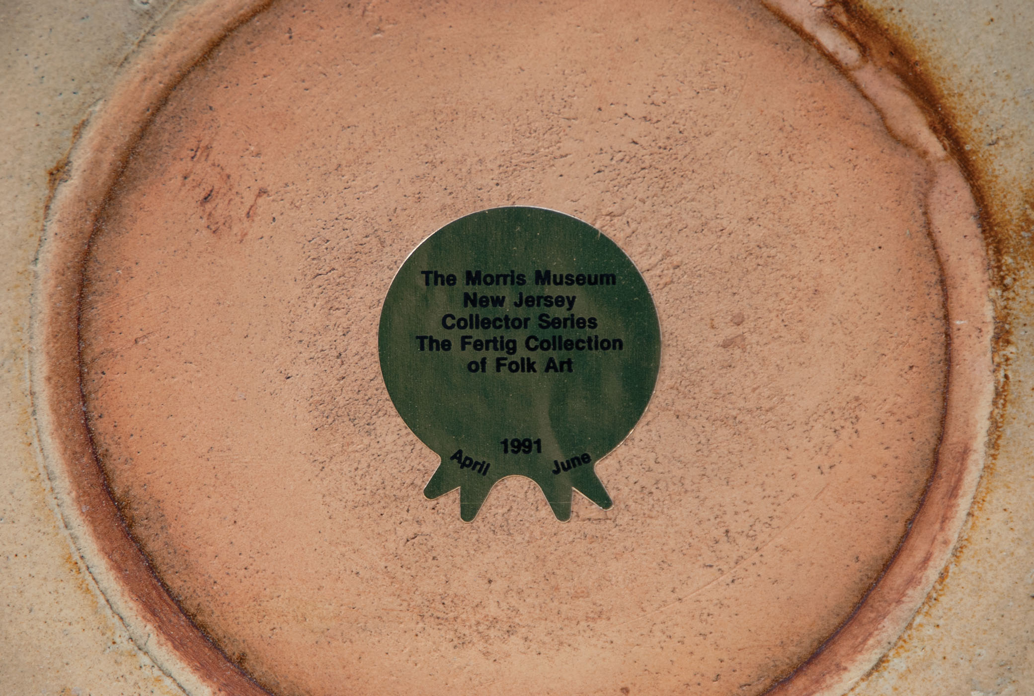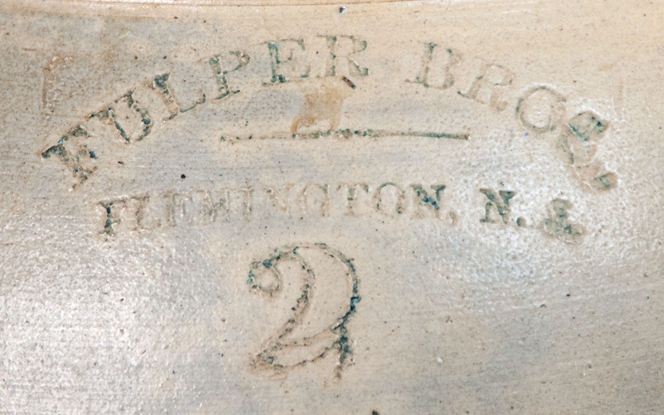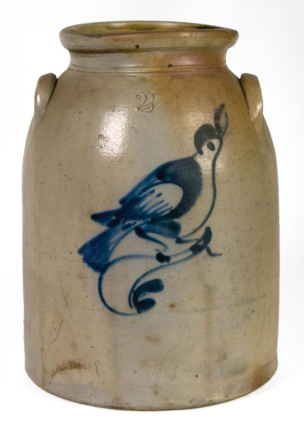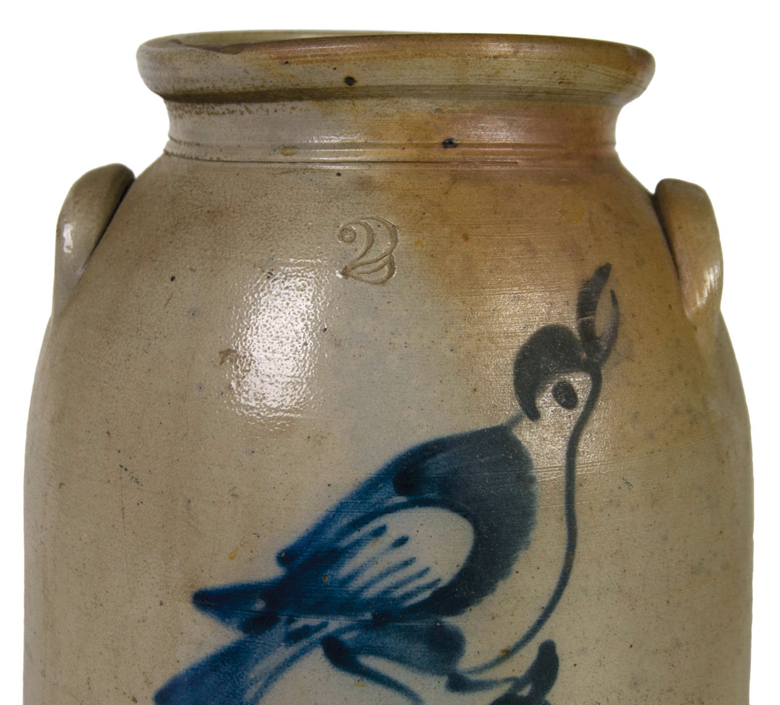 Two-gallon, Fulper Bros., with cobalt birds on branches, one crock has chipped lid and toning, (exhibited at the Morris Museum, NJ Collector Series, April-June 1991, The Fertig Folk Art Collection); the other has a crack from the base to the tail feathers and toning, 12″ l; (ex. Fertig collection).