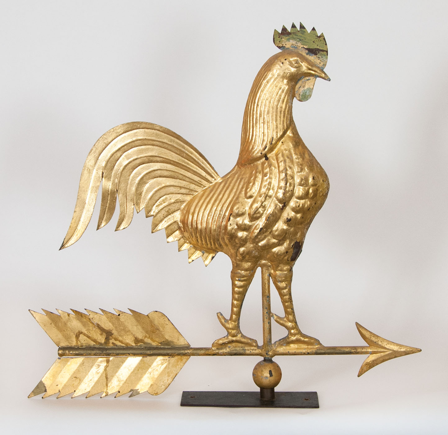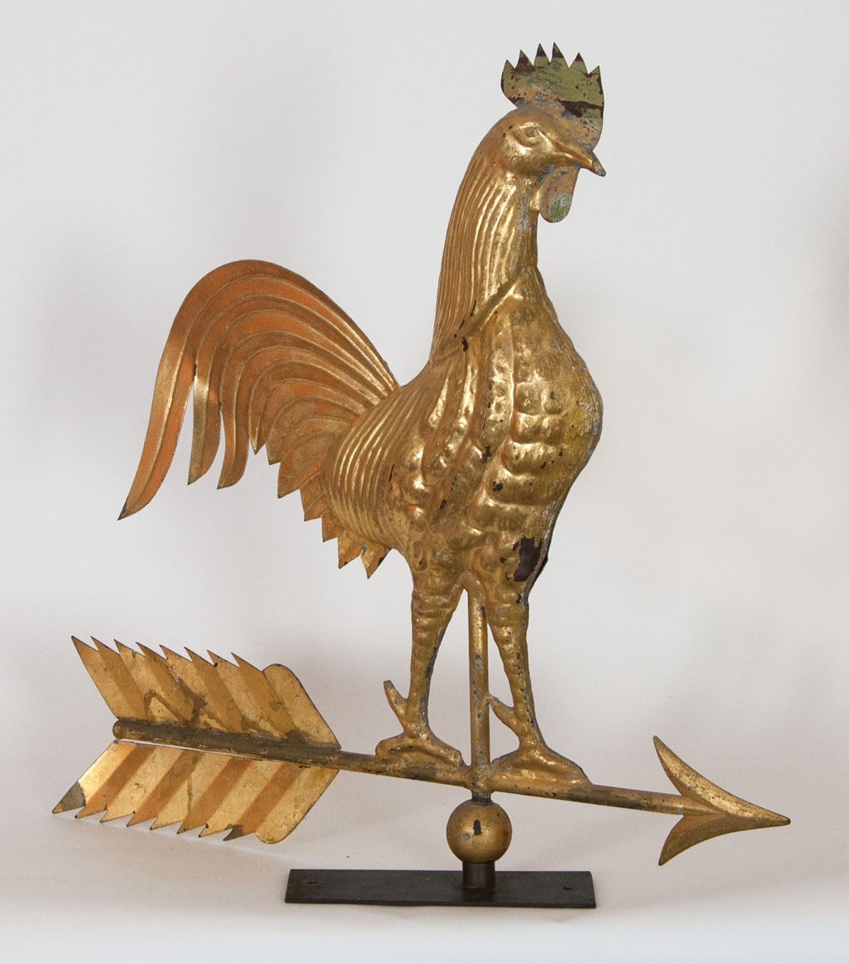 Full-bodied, gilded copper, finely detailed feathers, some gilt loss on comb, 23″ h, 23 1/2″ l, (ex. Dr. Oscar and Lois Hollander collection, Falmouth, MA).