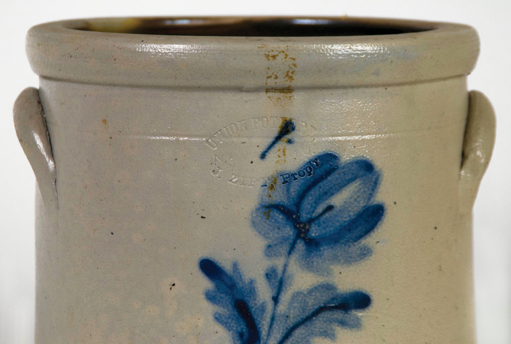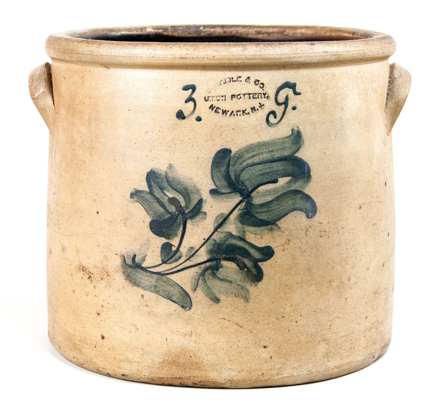 Union Pottery, with cobalt tulips, the larger marked “C. Haidle & Co”, “Newark, NJ”, and “3.g.”, in good condition, 10″ h, 11″ dia; the smaller marked “J. Zipf Prop'r” and “Newark, NJ”, in good condition, 7 1/4″ h, 8 1/4″ dia; (ex. Fertig collection).