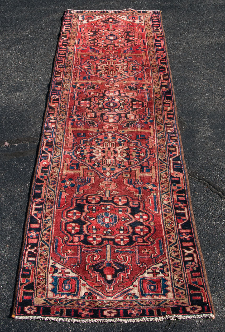 Oriental rug, rust/red field with five guls, highlighted by royal blue, salmon, ivory and tan geometric designs, double border, very good condition, 3' 1″ x 12' 2″.