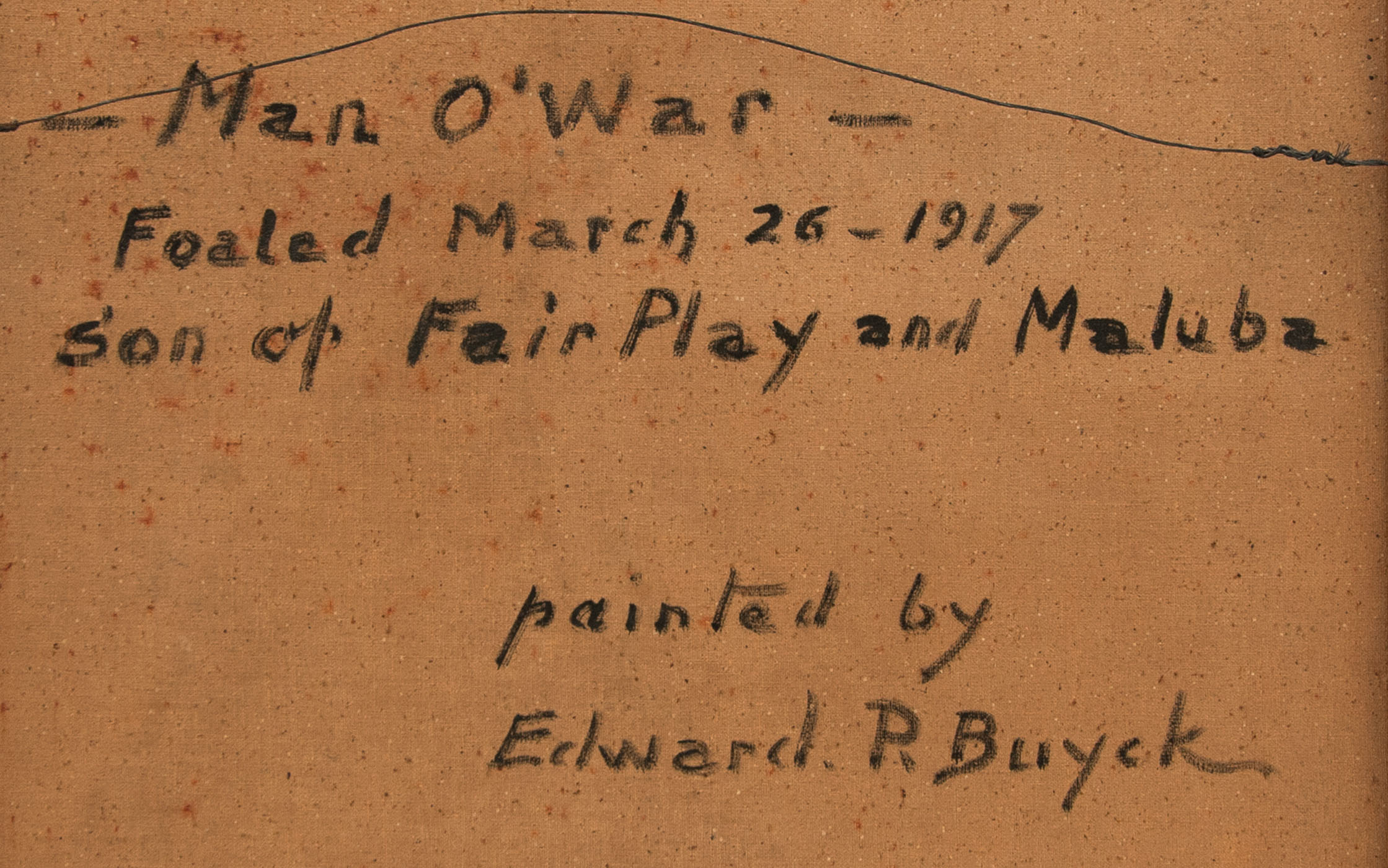 Oil on canvas of the horse “Man O' War”, signed l.r. “Edward P Buyck” (Edward Pierre Buyck, Belgium, 1888-1960, studied art in Bruges, Antwerp, and Paris), signed on back of canvas “Man O' War – Foaled March 26 1917 Son of Fair Play and Maluba”, reverse of frame labeled with artist name and title, considered one of the greatest thoroughbred race horses of all time, won 20 of 21 races, comes with history of Man O' War, carved original cherry frame, 30″ x 25″ (frame), (ex. Ed Clerk collection).