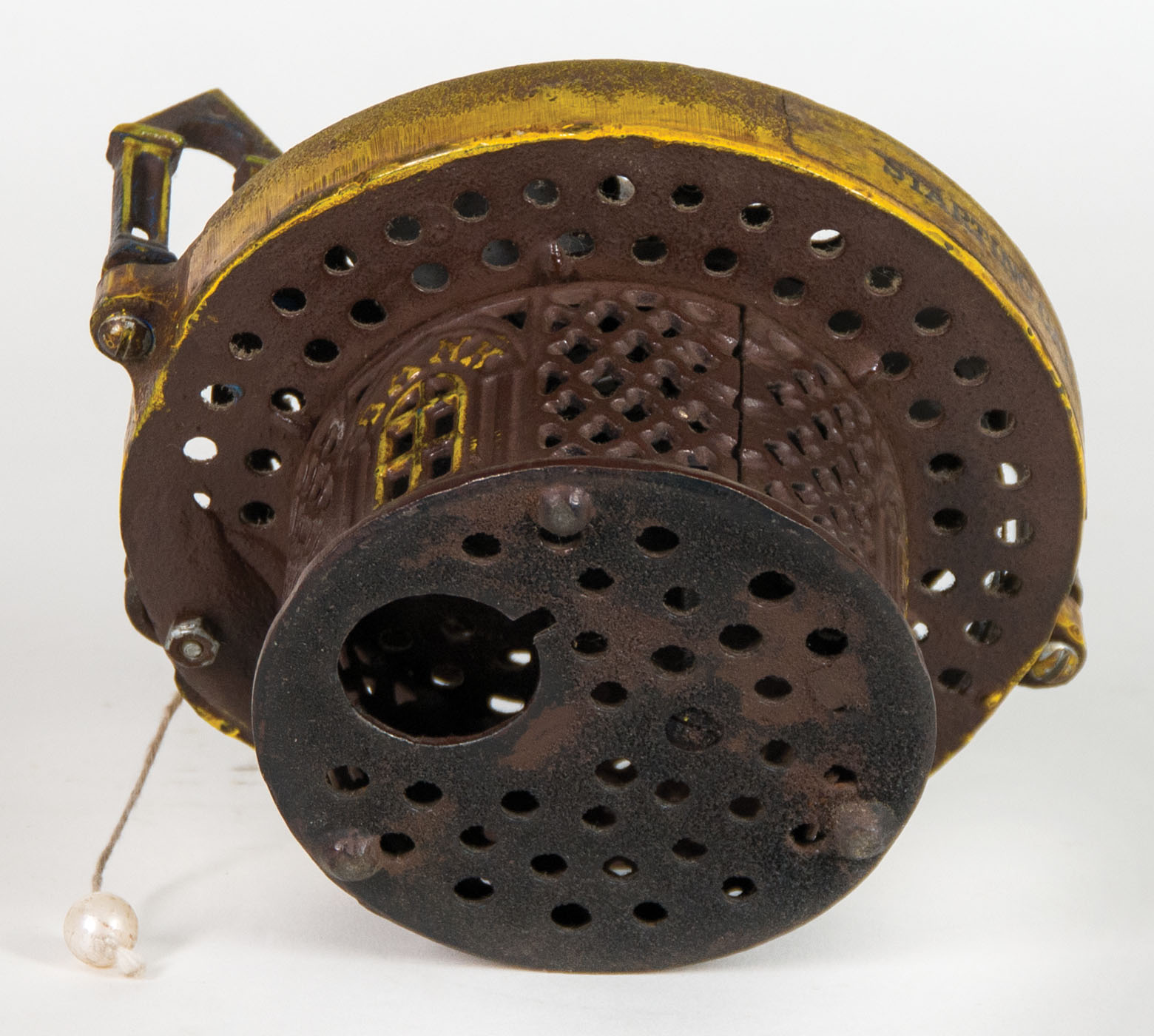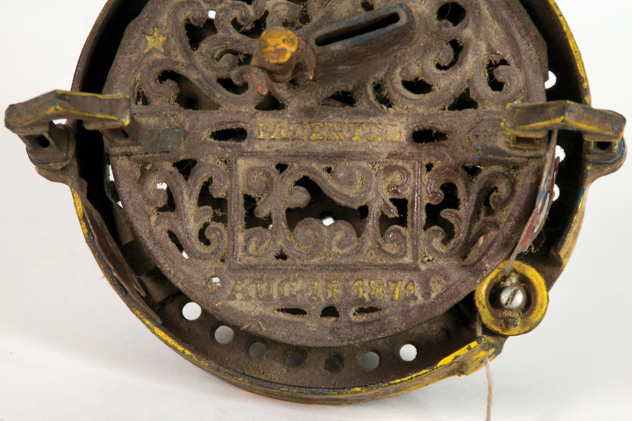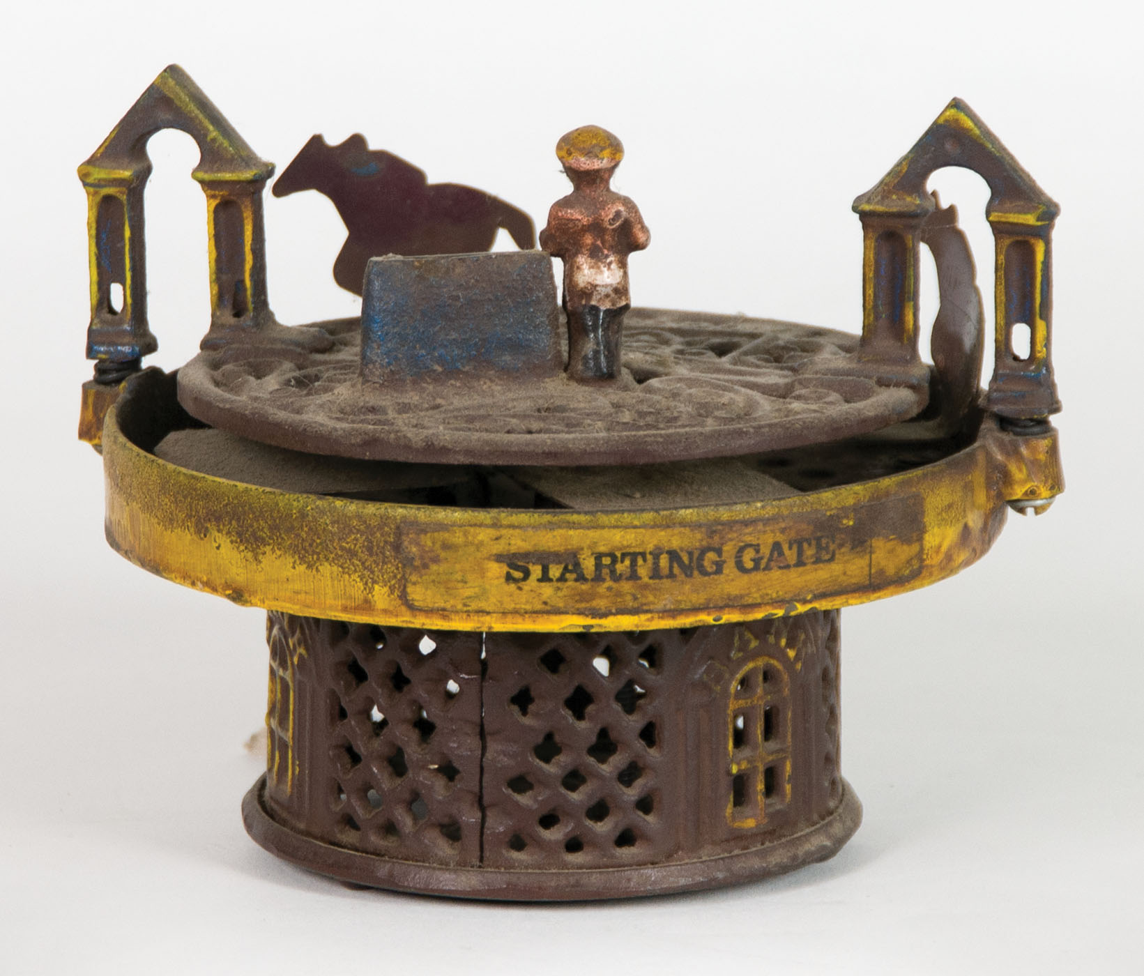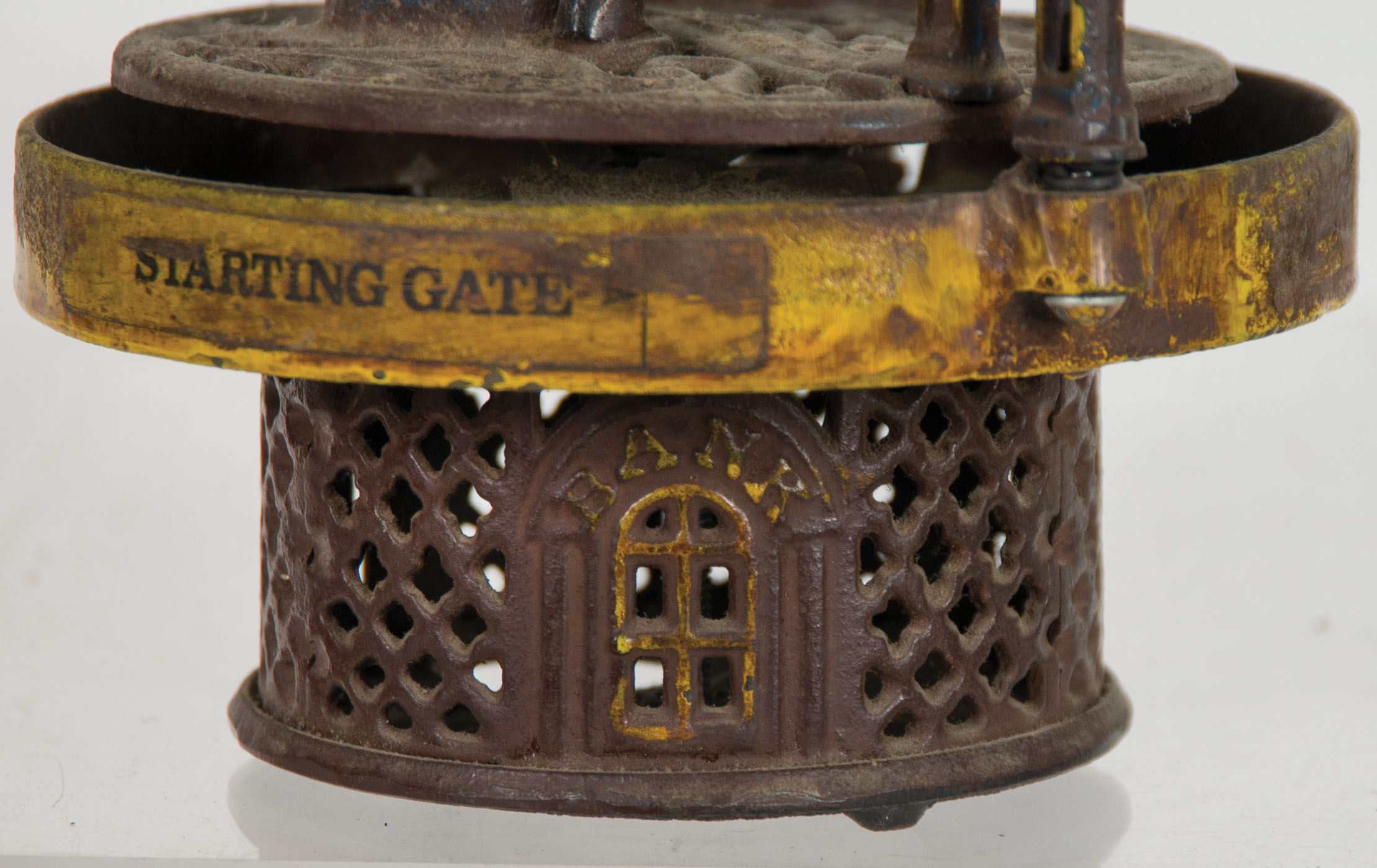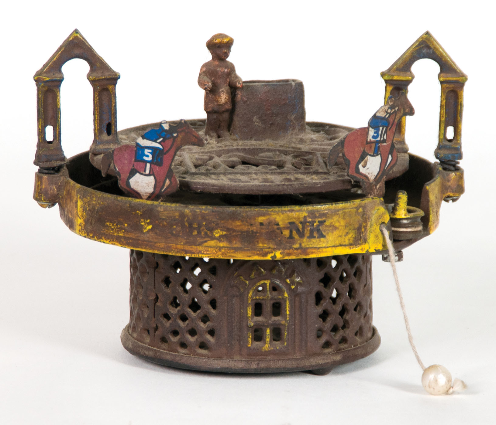 Cast iron, Race Horse Bank, original paint, “patented, Aug 15, 1871″, with two painted tin horses and jockeys, cast iron open work bank down under the racers, 5″ h, 5 3/4” dia.