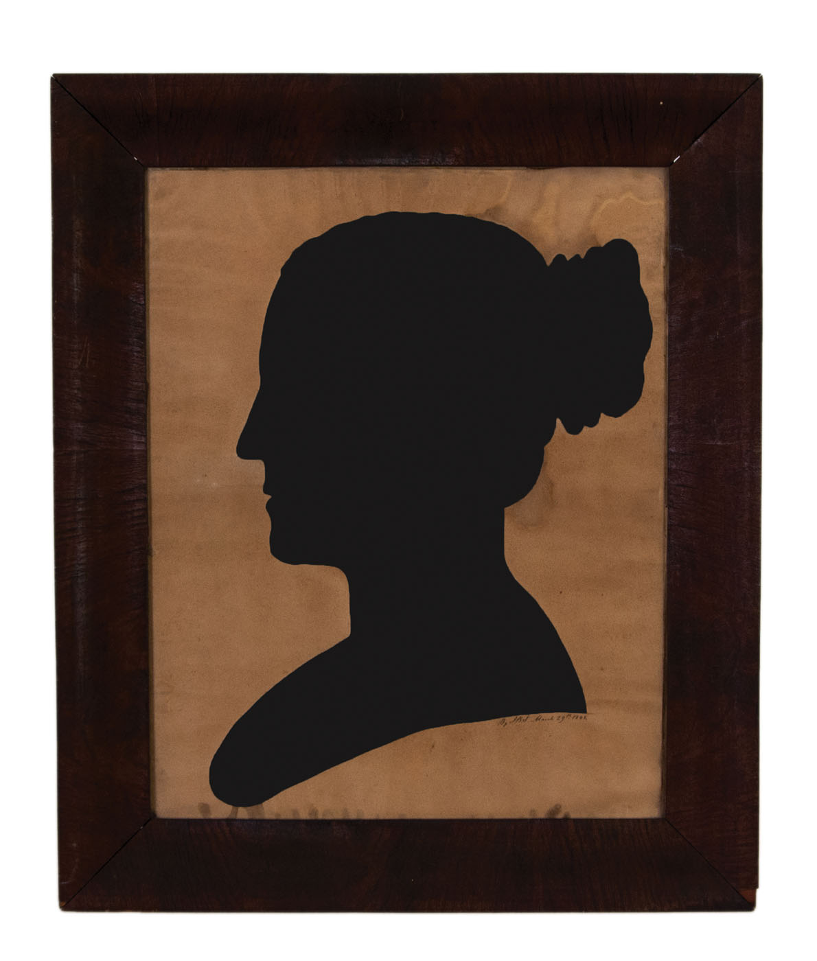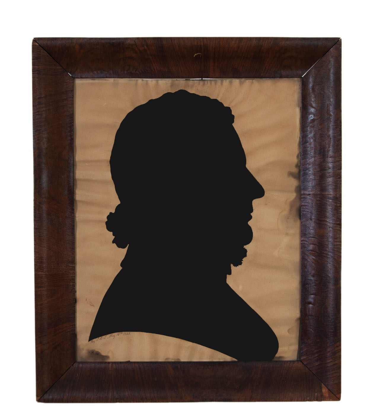 Large profile silhouettes of husband and wife, signed and dated “J.B.S. May 26 1833” and “J.B.S. March 29, 1843″ below each shoulder, both in period matching ogee mahogany veneered frames, some staining and wrinkles, both 17 1/2″ x 13 3/4” (sight), (ex. Dr. Oscar and Lois Hollander collection, Falmouth, MA).