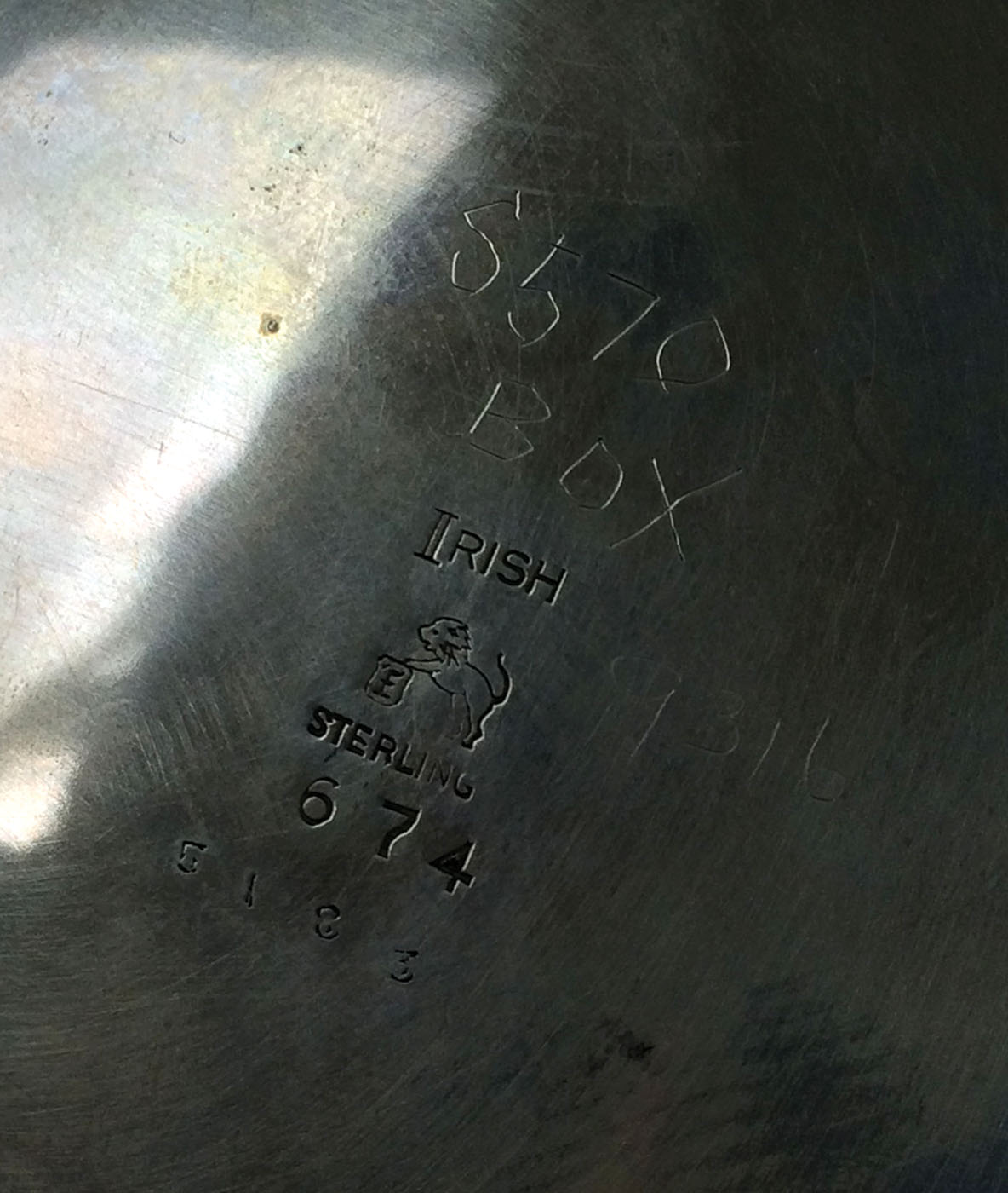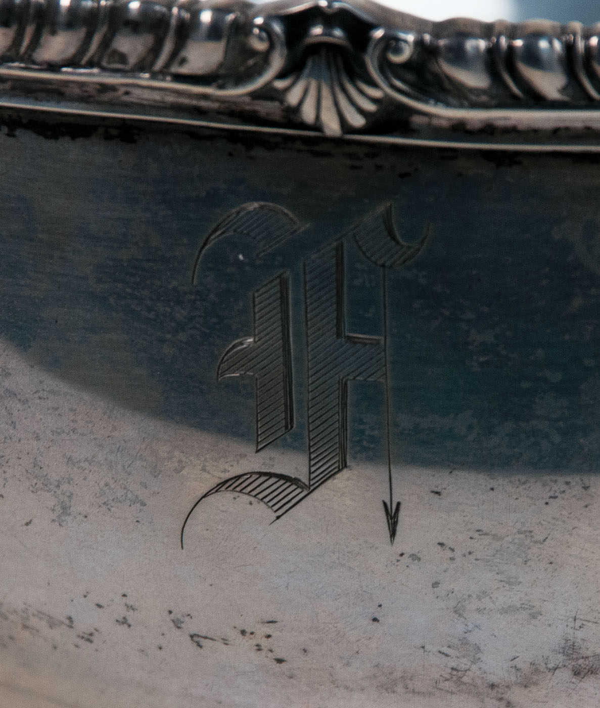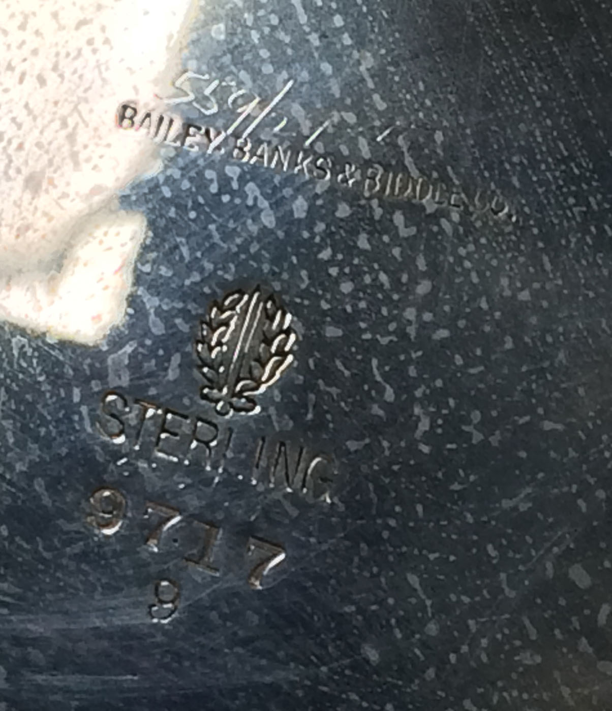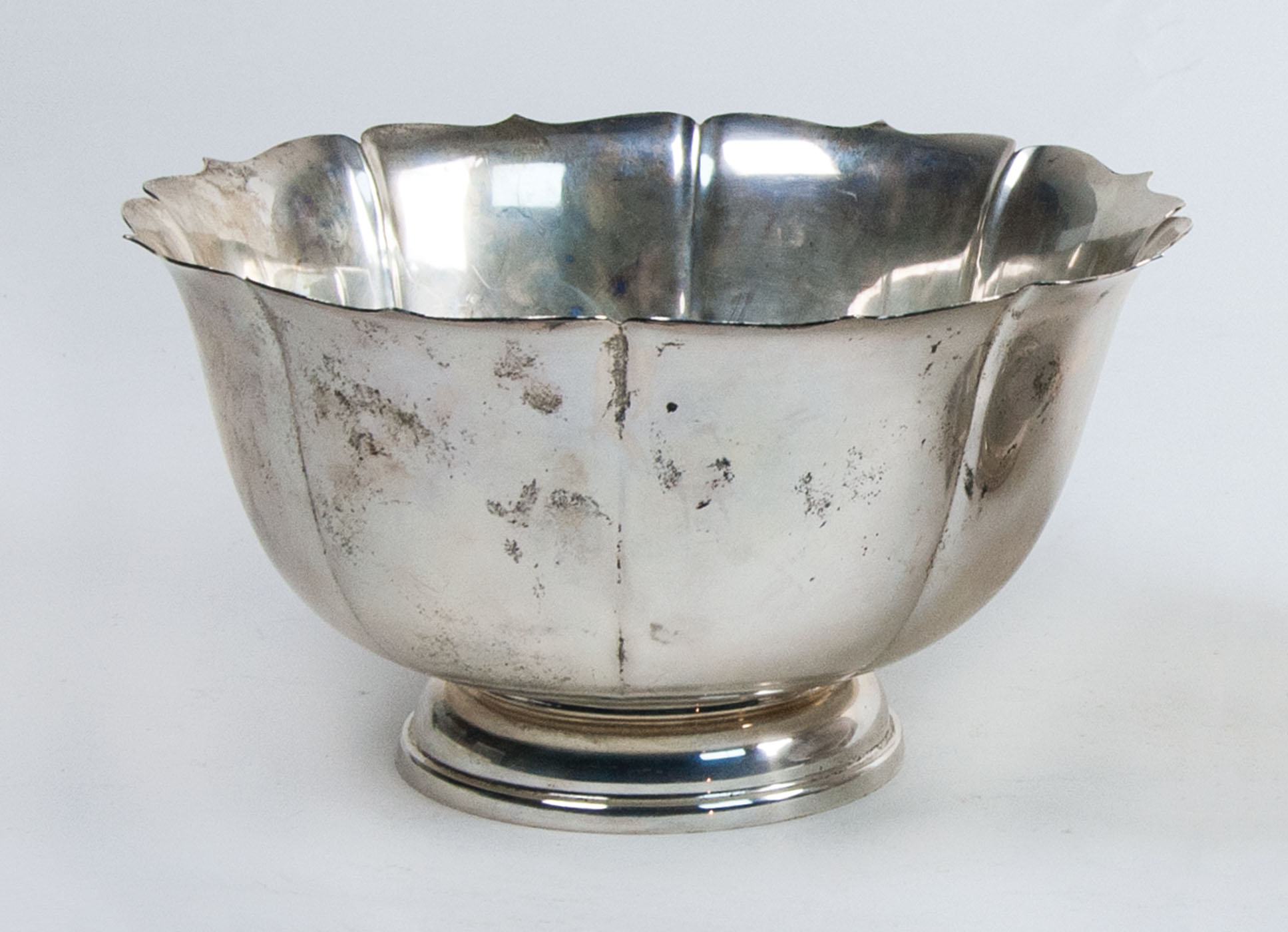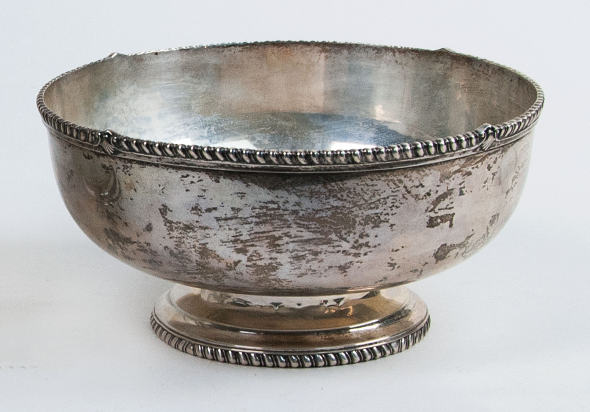19th c. American sterling silver footed fruit bowl, functional rope turned border with four scalloped points, monogrammed initial “F” with a downward facing arrow, Bailey Banks & Biddle Co. hallmark, “# 9717″, 21.5 ozt, 4 1/2″ h, 9″ dia; 20th c. sterling silver compote/fruit bowl, curving petal pattern, Ellmore Silver Co. Inc. hallmark, 30.75 ozt, 5 3/4″ h, 10 1/2” dia.