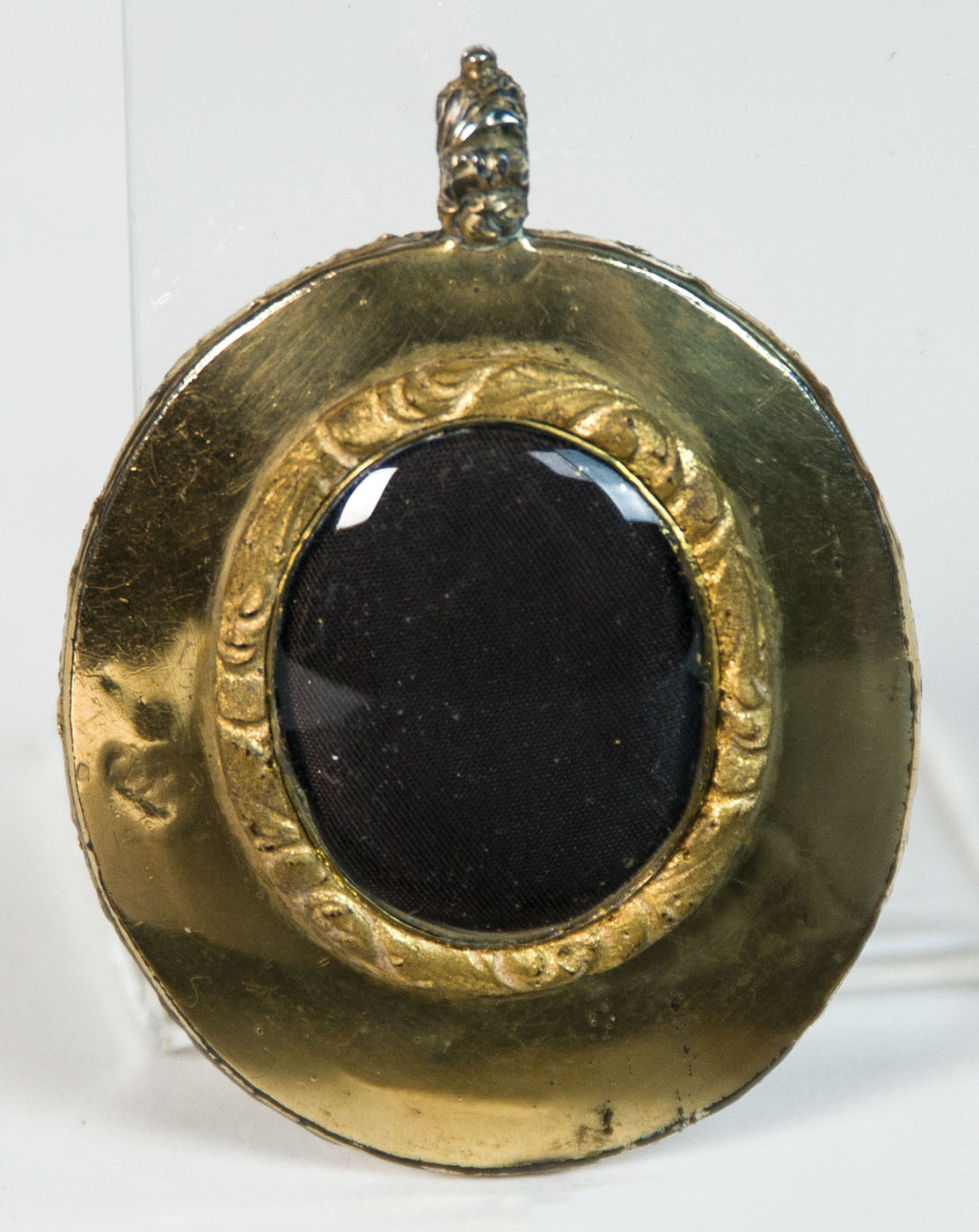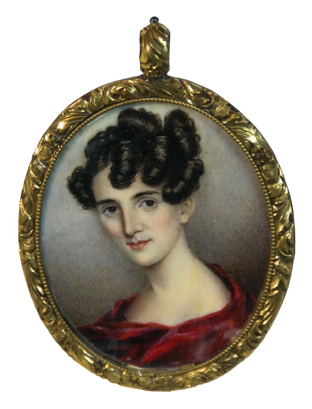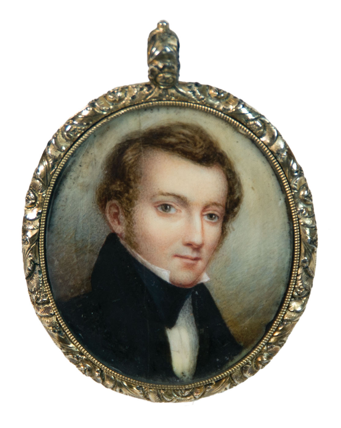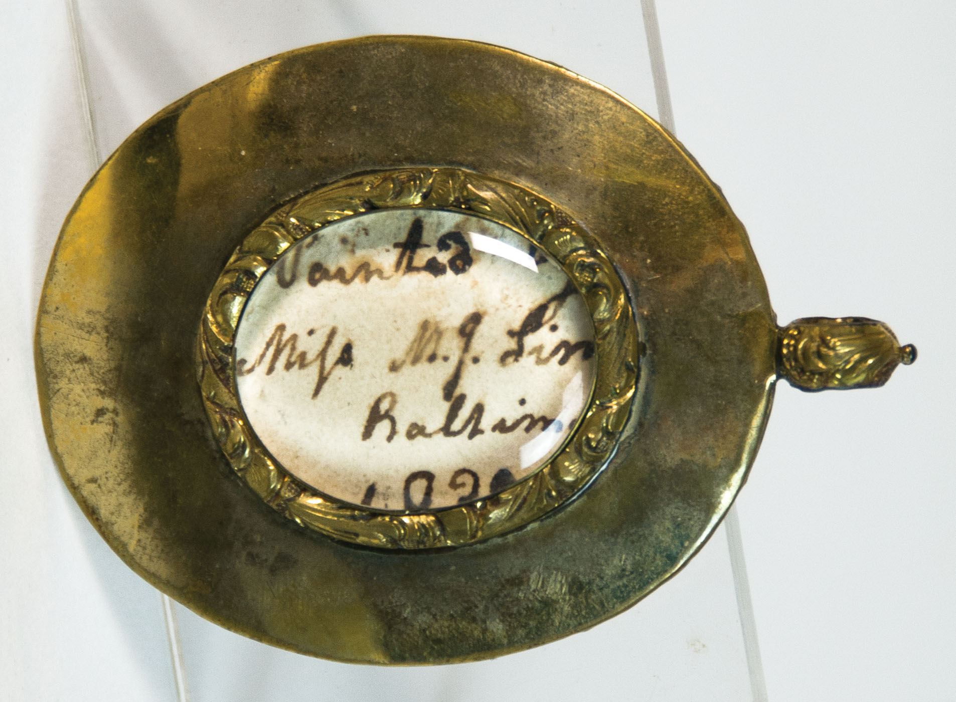 Very rare 19th c. watercolors, both in encased gilded copper under glass, original paper backing is inscribed in sepia ink “Painted by/ Miss M.J. Simes/ Baltimore/ 1832.” (Mary Jane Simes, American, 1807-1872, granddaughter of James Peale), 1 17/16″ x 1 9/16″ (woman), 1 3/4″ x 1 1/2″ (man).