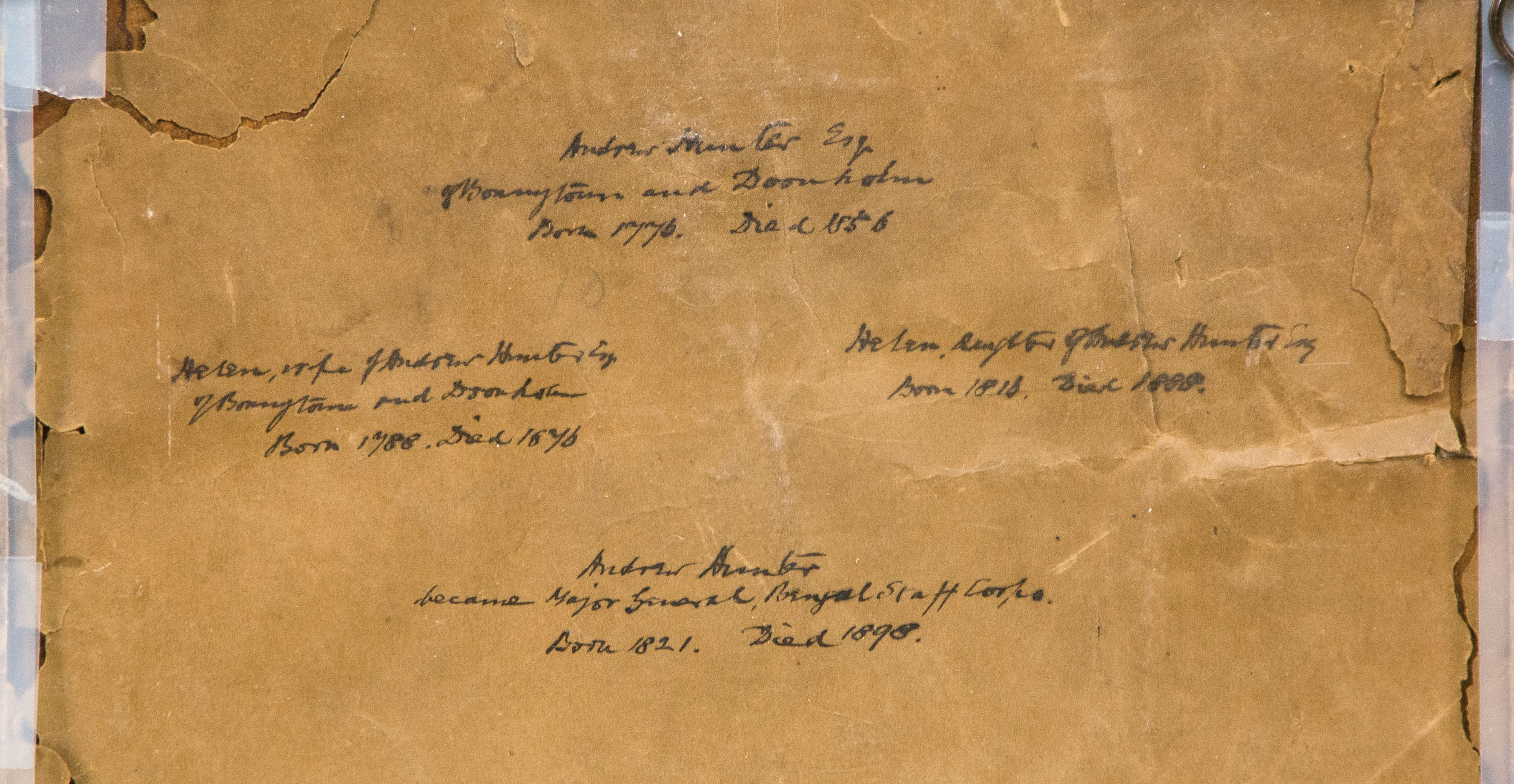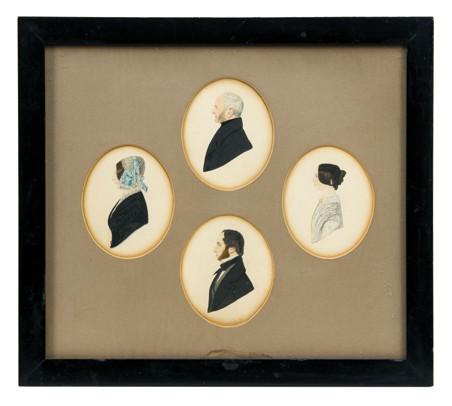 Portraits on paper, of the Hunter Family of Bonnytown and Doonholm, Ayrshire, with history on reverse, features Andrew Hunter Esq. (1776-1856), Helen Hunter (1788-1876), daughter Helen Hunter (1815-1888), and son Andrew Hunter (1821-1898), who became a Major General in the Bengal Staff Corps., in good condition with minor toning, 9″ x 10 1/2″ (sight), (ex. Fertig collection).