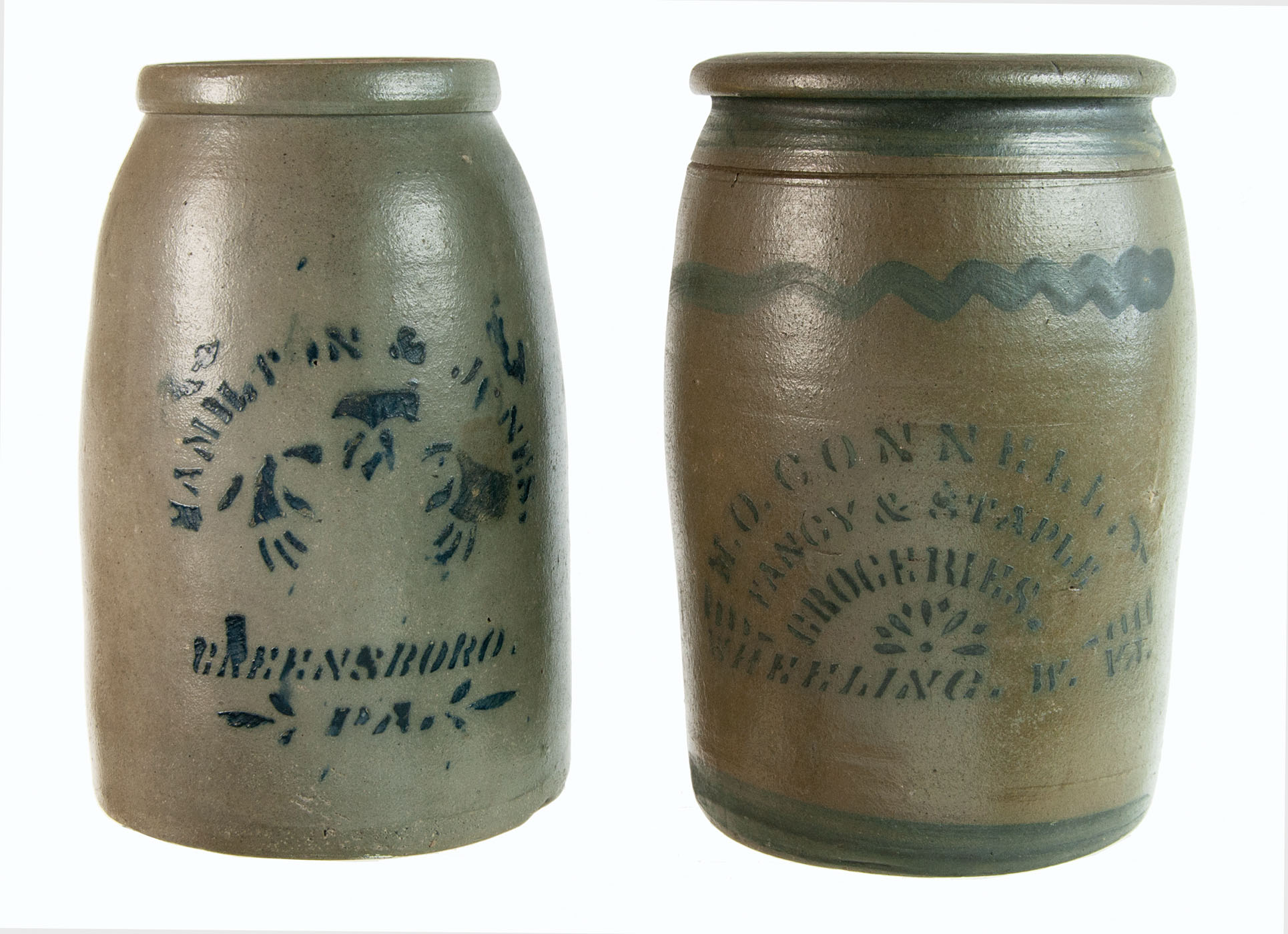 Pennsylvania, with cobalt decoration; the larger marked “M.O. Connell Fancy & Staple Groceries, Wheeling W. PA.”, minor chipping present, 10″ h; the smaller marked “Hamilton & Jones, Greensboro, PA”, minor toning present, 9 3/4″ h; (ex. Fertig collection).