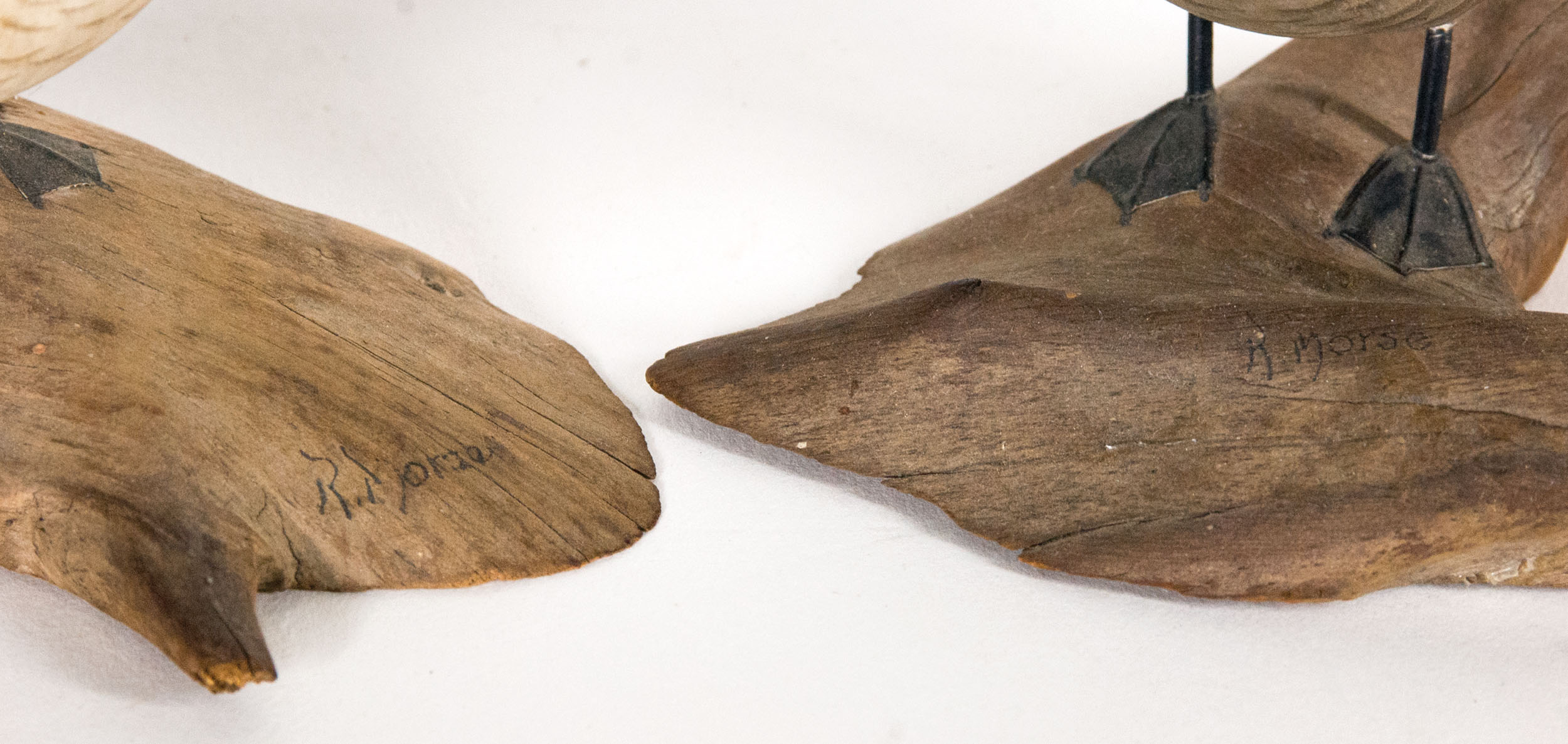Carved wooden decoys, standing on carved wooden tree stumps, bases signed “R. Morse” (Ellsworth, Maine, 1910-1959), excellently detailed, one with crack on neck, 4 3/4″ h, 4 1/2″ w.