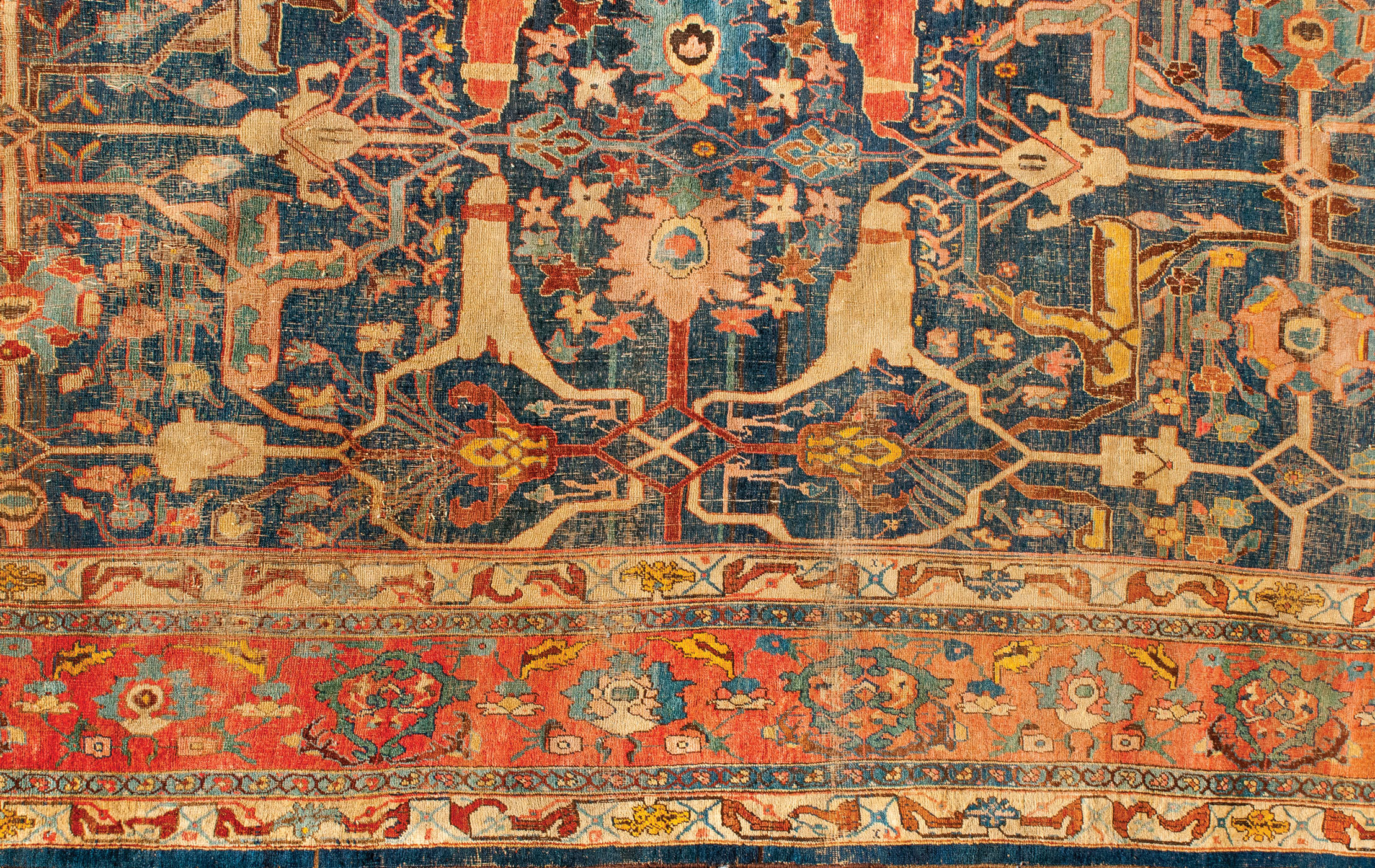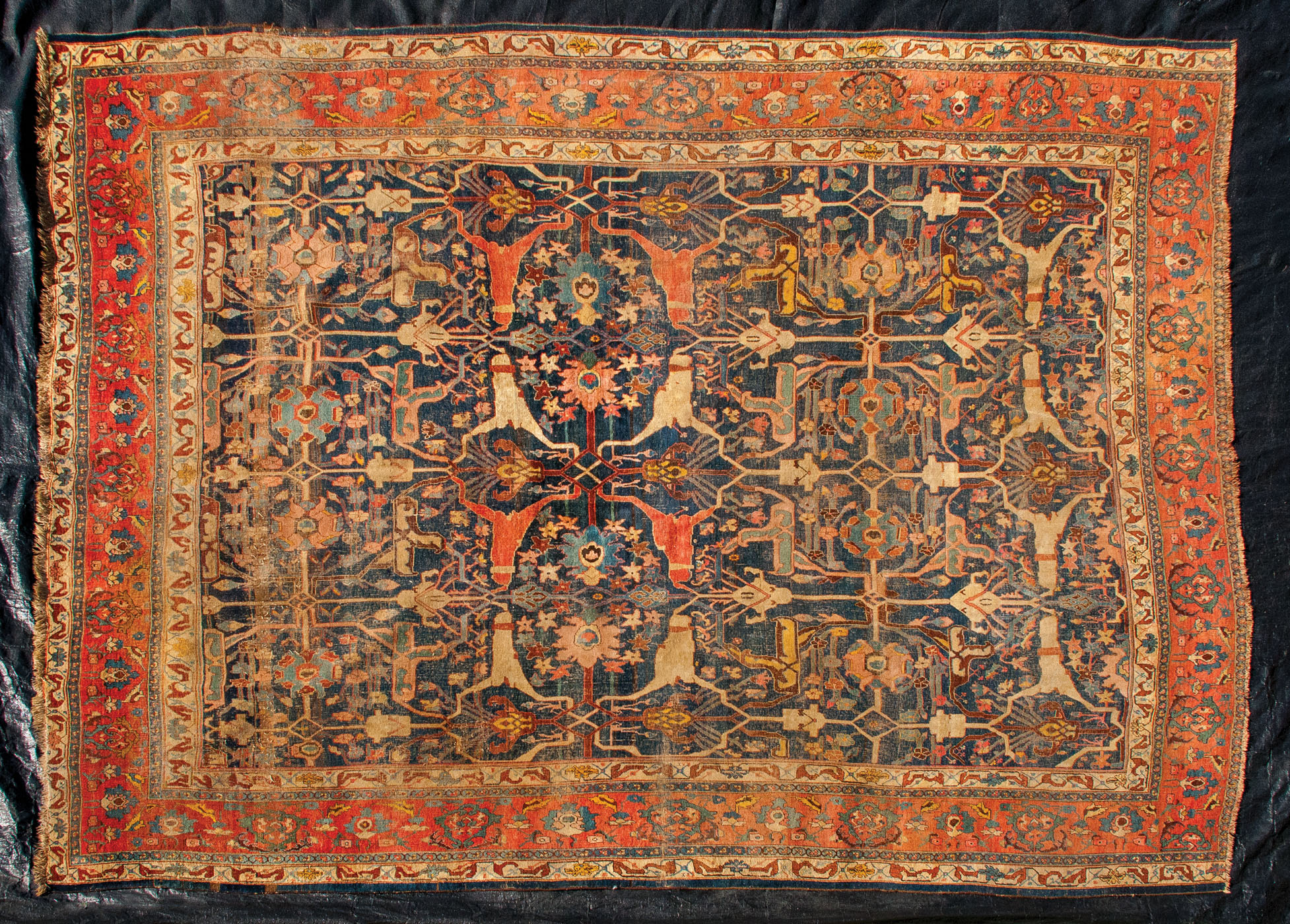 Blue field, background with interwoven designs, five outlining borders, overall wear, 13' 6″ x 11' 1″.