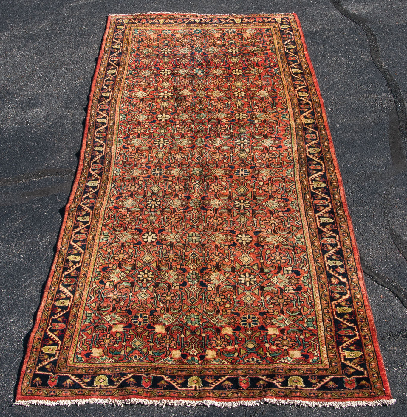 Oriental rug, salmon field with intricate small overall designs, with four borders in greens, blues, tans and navy, very fine condition, 4' 4″ x 10' 7″.