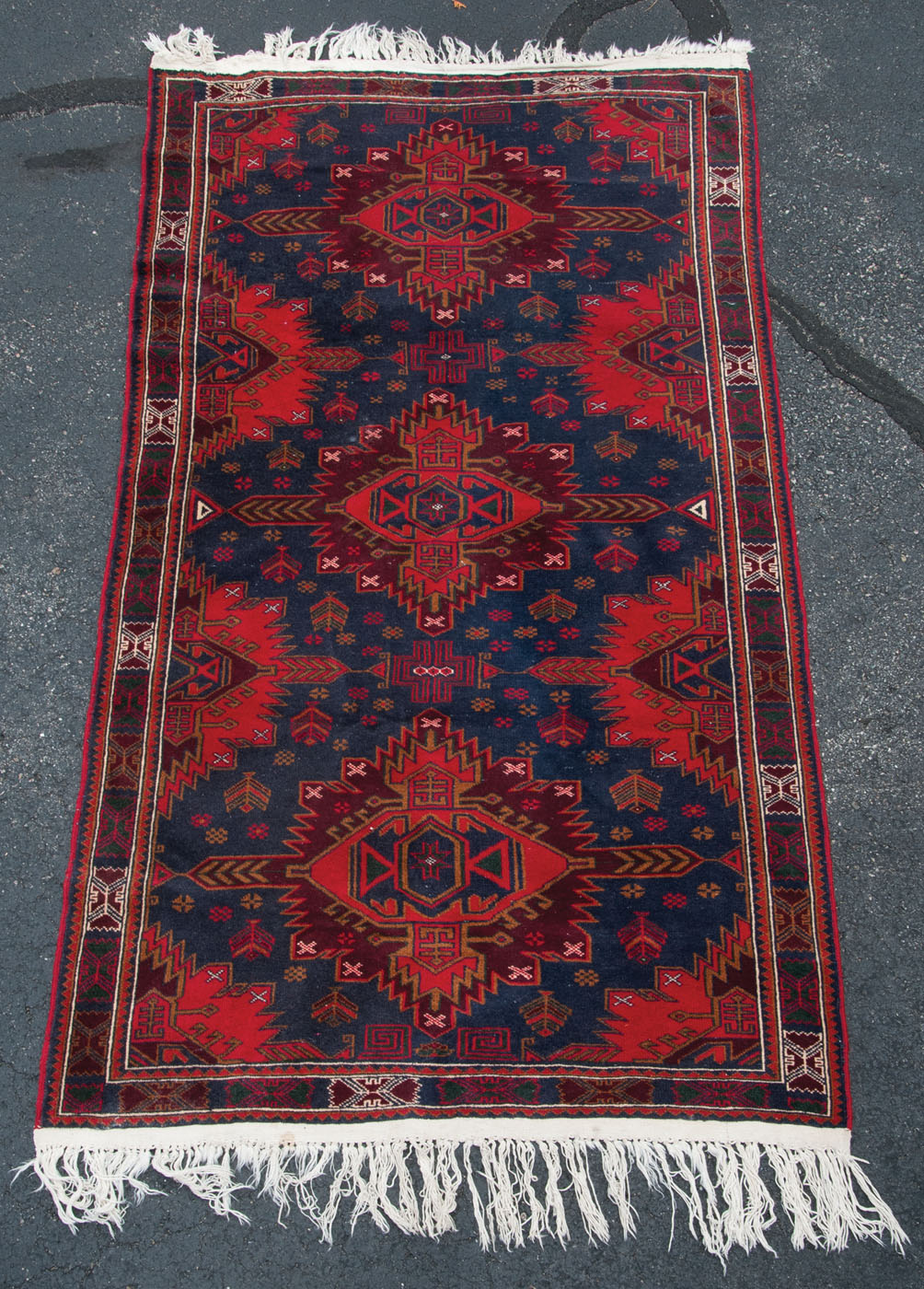Persian Hamadan rug with navy field, three central guls with scarlet, cranberry and gold colors, three borders, good fringe, nickel size dip in pile, overall good condition, 3′ 6″ x 6′ 6″.