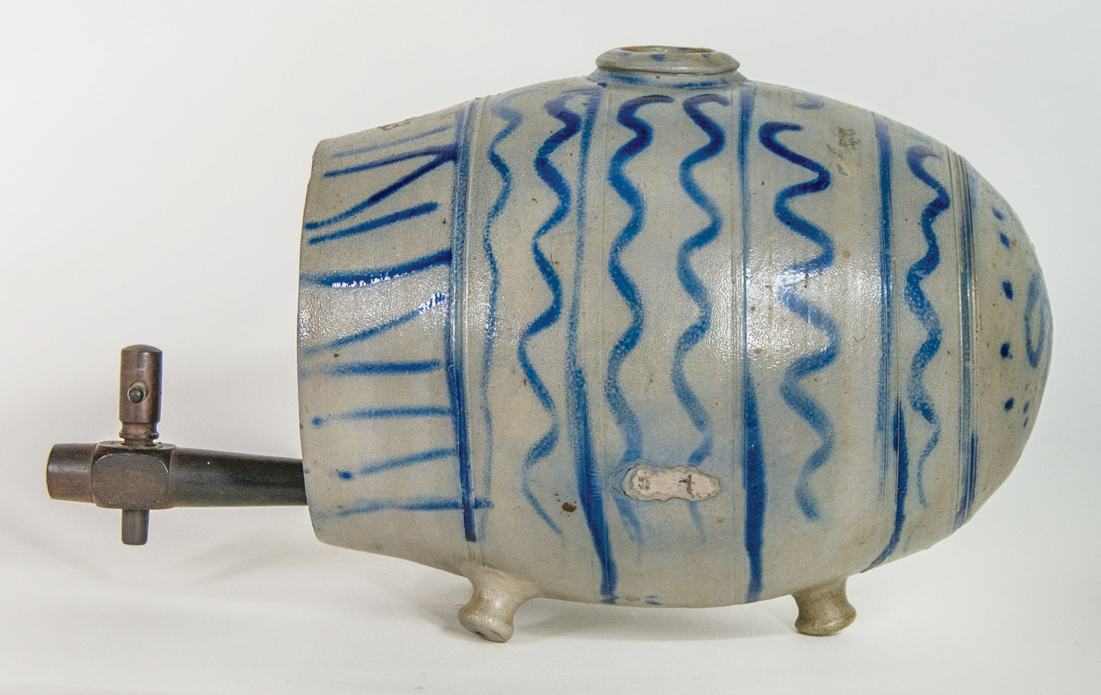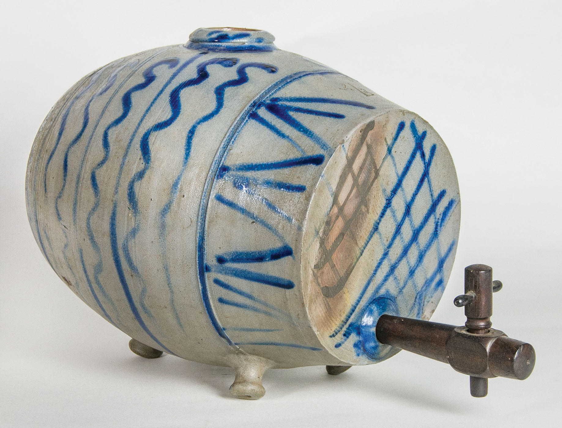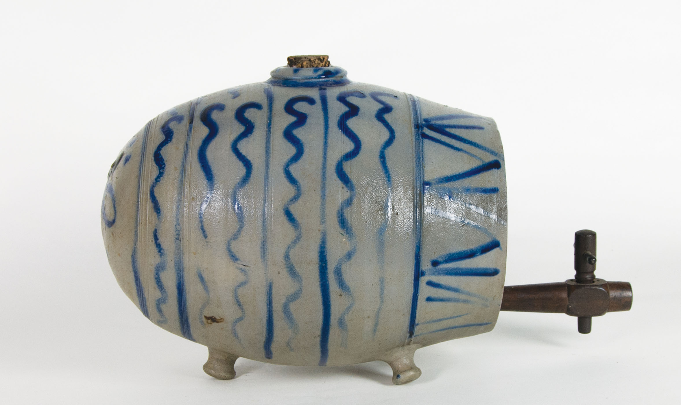 “Blind Pig” rundlet, with overall blue decoration with squiggles, cross-hatch, floral back, three-footed, marked “2/3″, filling hole with cork and original wood spigot, possibly Pennsylvania, 10 1/2″ h, 13 1/2″ l, 5” spigot.