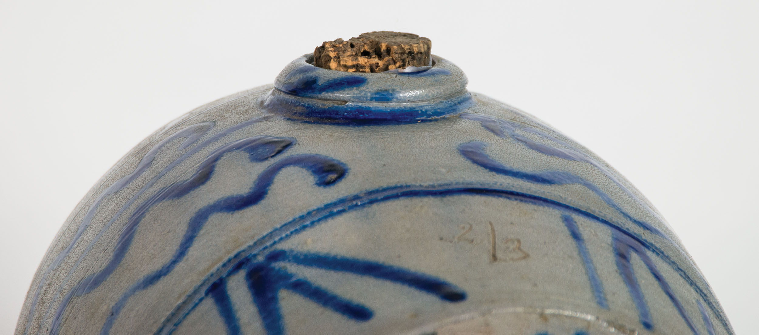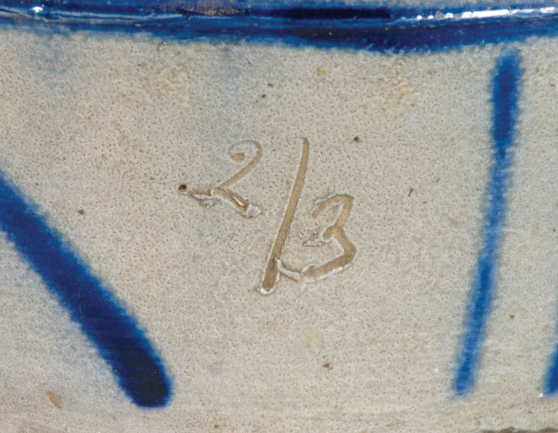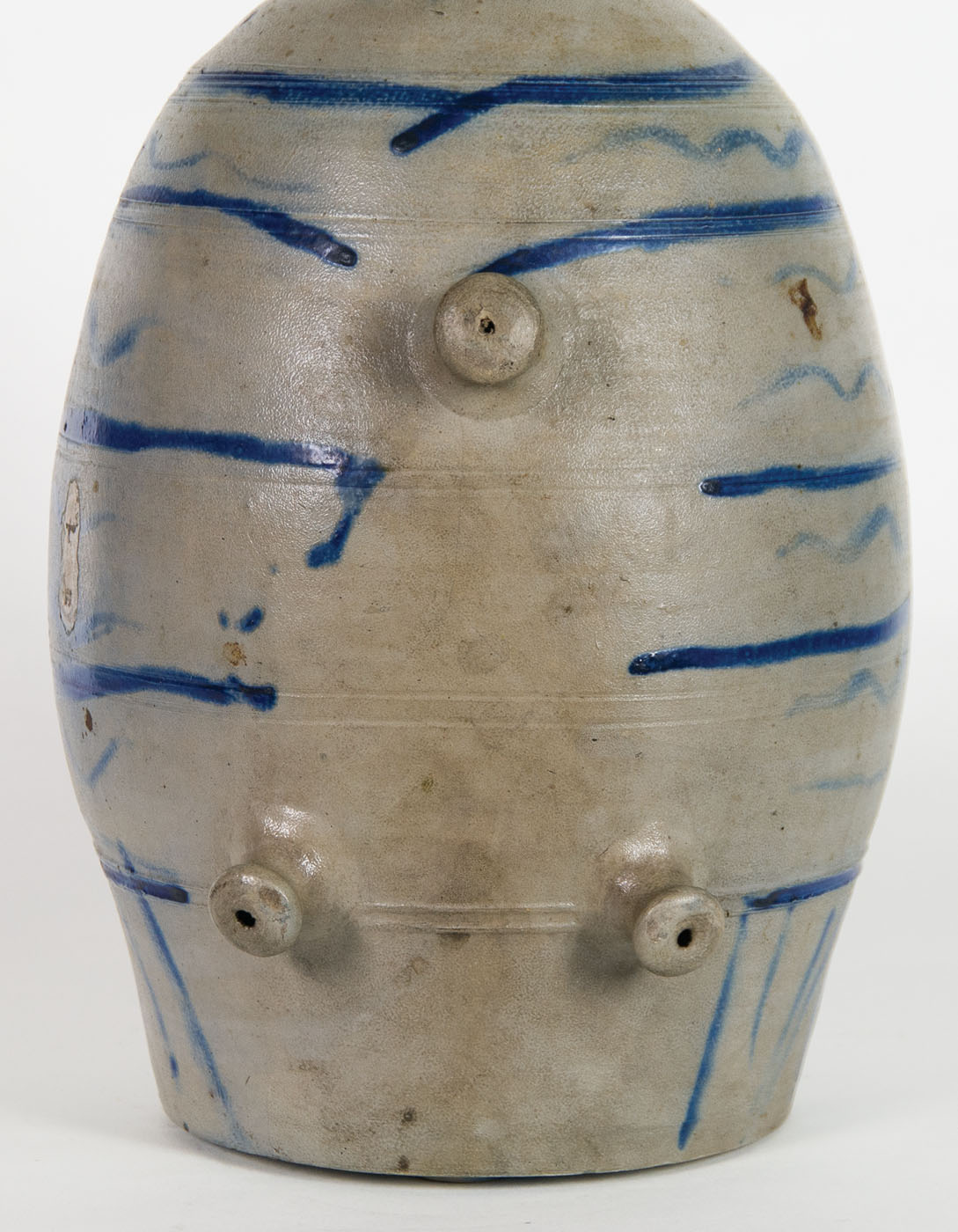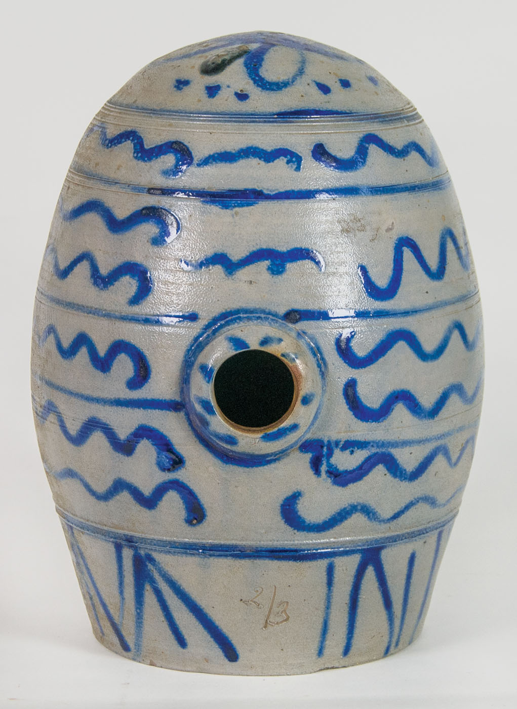 “Blind Pig” rundlet, with overall blue decoration with squiggles, cross-hatch, floral back, three-footed, marked “2/3″, filling hole with cork and original wood spigot, possibly Pennsylvania, 10 1/2″ h, 13 1/2″ l, 5” spigot.