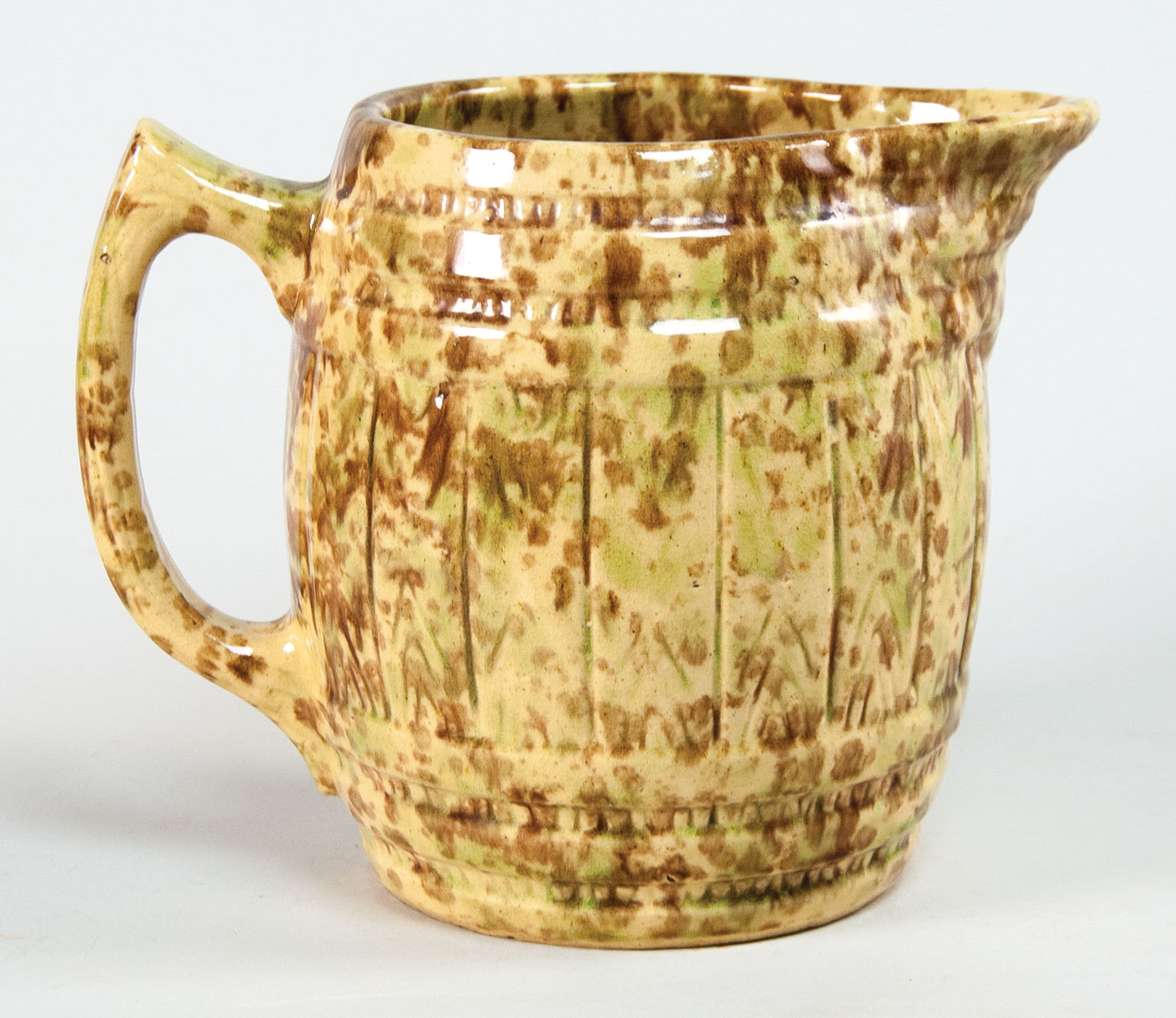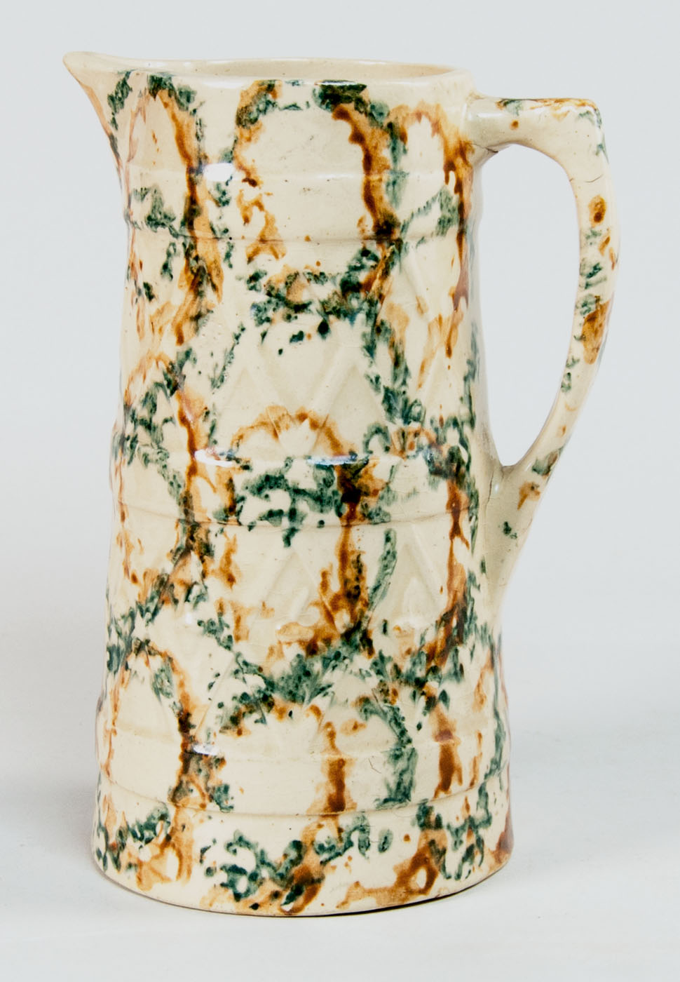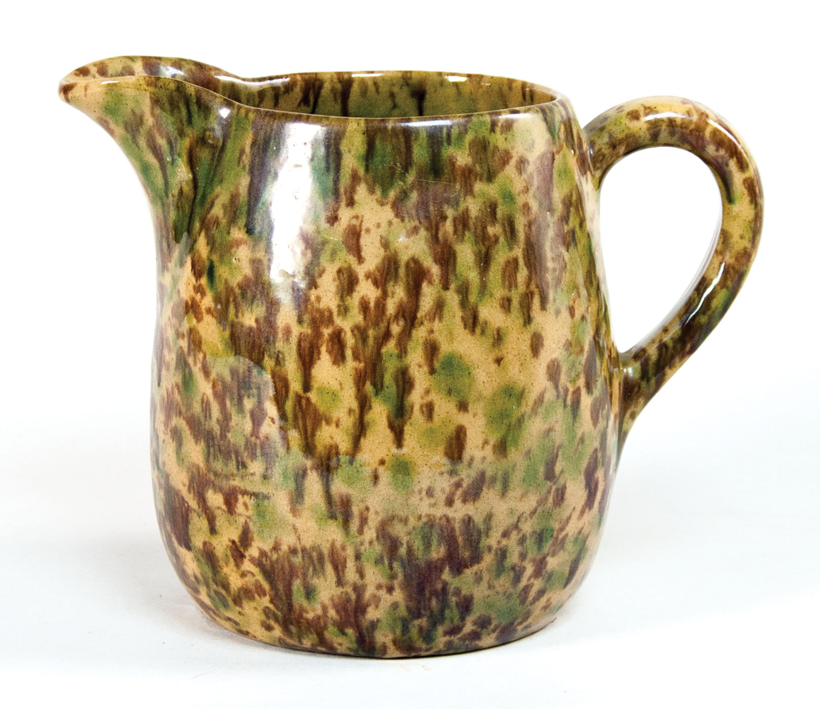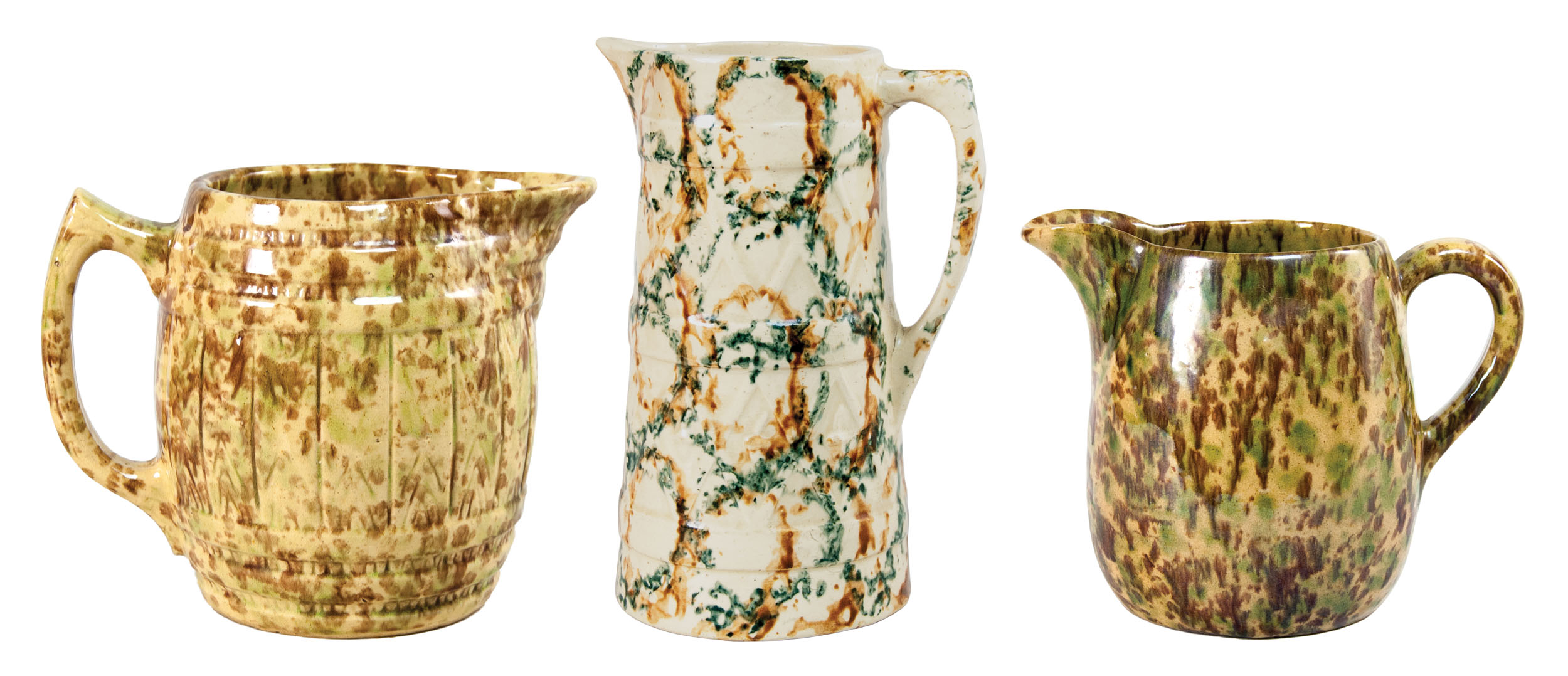 Barrel form, with mottled green and brown, applied handle, in good condition with two small pits from firing present, moderate crazing throughout, 7 1/2″ h, 6″ dia; Tankard form, with concentric blue/green and brown circles, on cream base, applied handle, in good condition with moderate crazing throughout, 9 1/4″ h, 5″ dia; Bulbous form, with mottled green and brown over dark tan base, applied handle, in excellent condition with moderate crazing throughout, 7″ h, 5 1/4″ dia; (ex. Fertig collection).