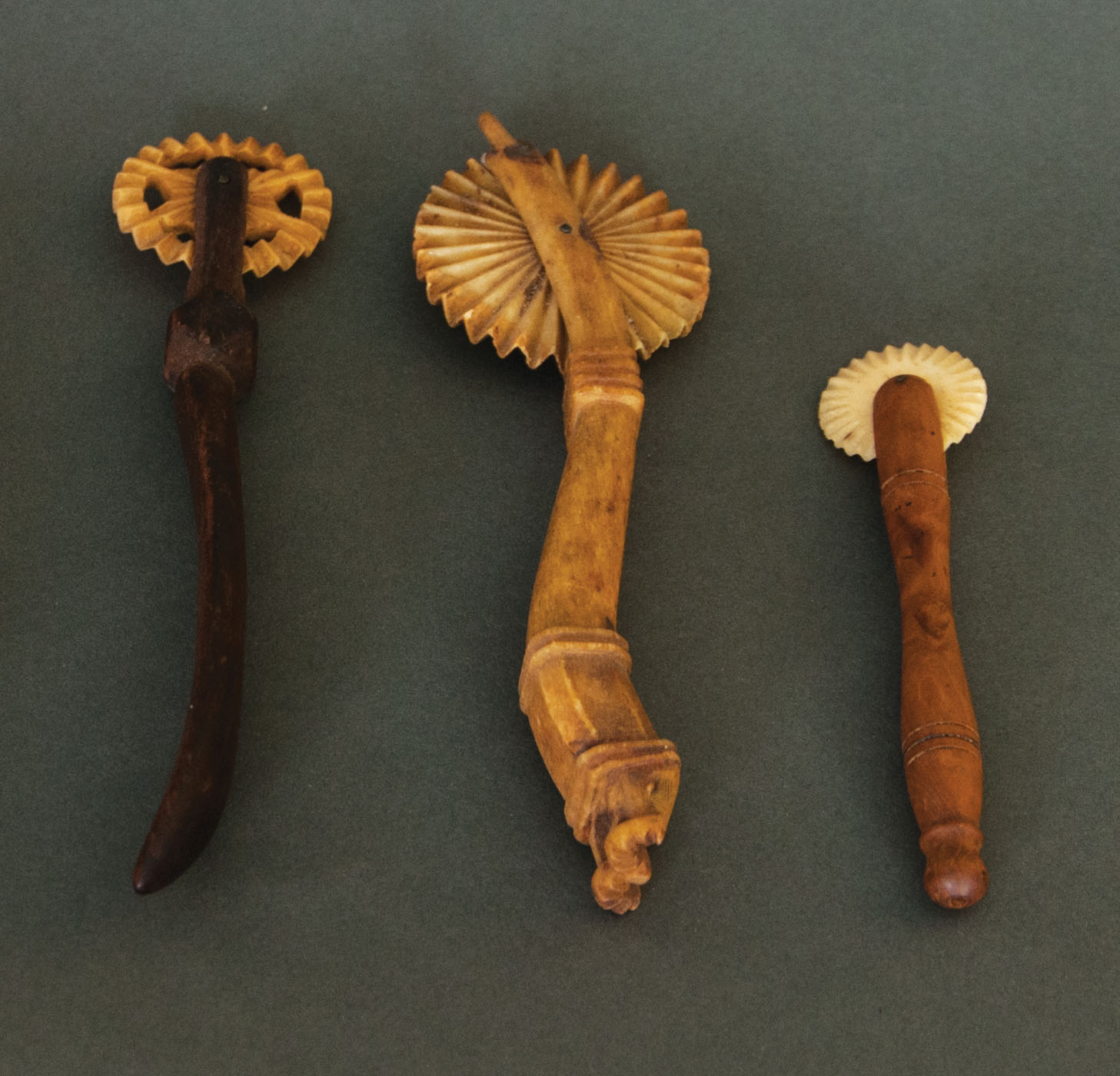 Sailor carved, two with carved hardwood handles; one with carved cube and flattened shaft, 7″ l; a small bone jagging wheel with turned wood shaft, 5″ l; and a whalebone crimper, with cross-hatching designs, 5 1/2″ l; (ex. Dr. Oscar and Lois Hollander collection, Falmouth, MA).