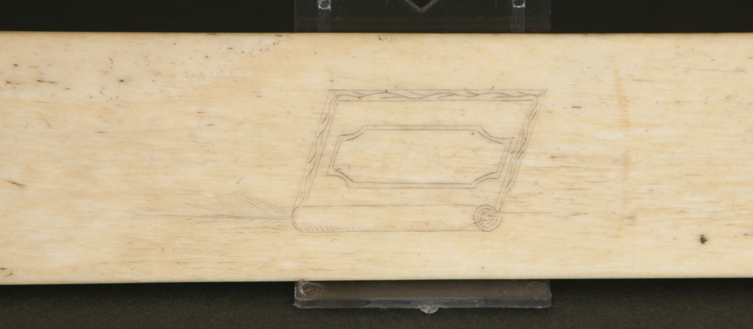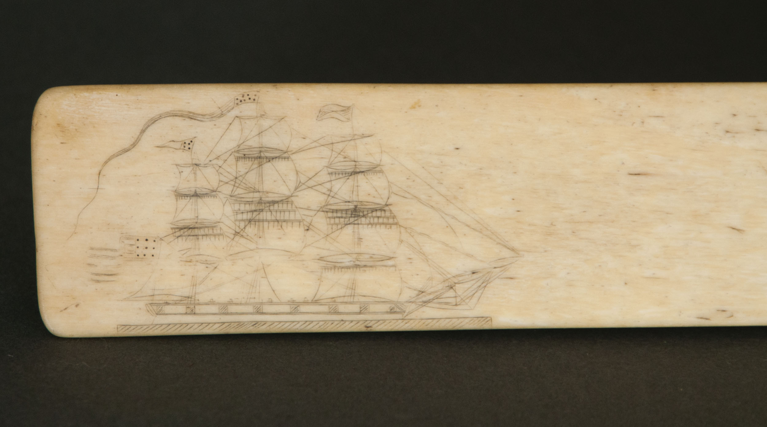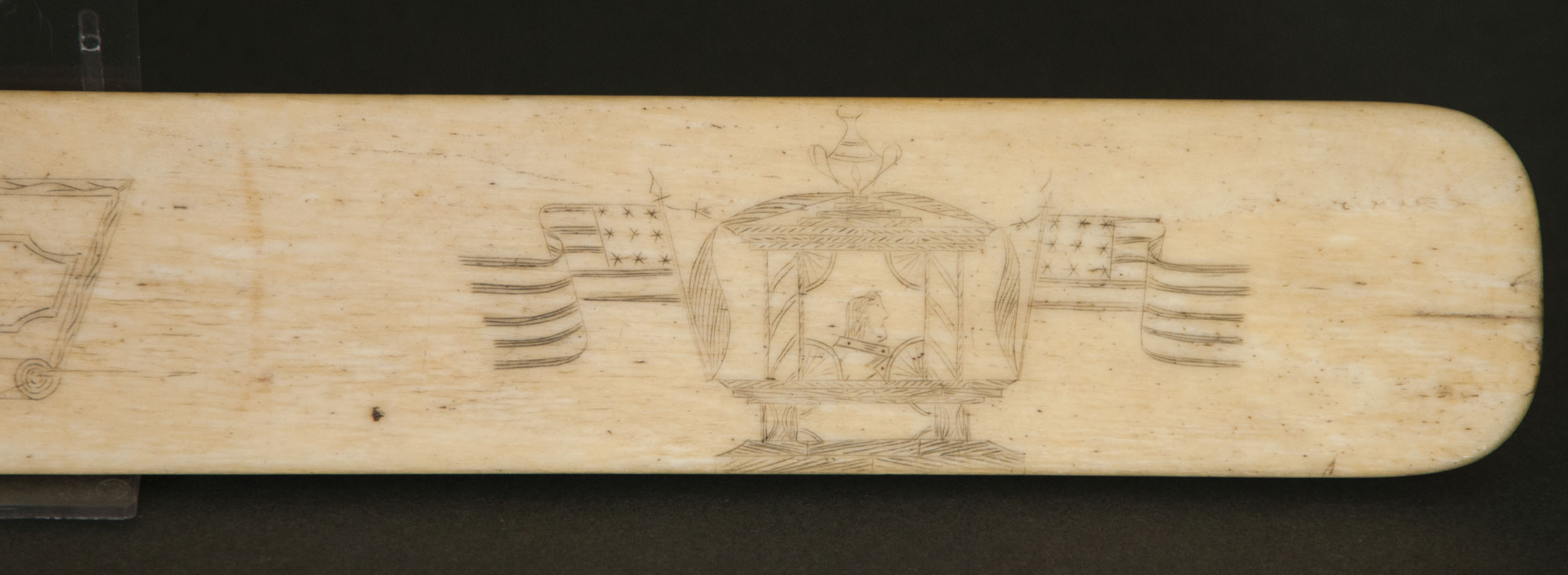 One decorated with a three-masted sailing vessel, an American flag and carriage with federal urn, and carrying a President and flying American flags, 13″ l; and the other with decorated concentric circles, woman with horse, man and woman with horse, “My Bonny Lass now turn to me”, an anchor, a Victorian woman posing, and four folk carved crescent men in the moons, 13″ l; (ex. Dr. Oscar and Lois Hollander collection, Falmouth, MA).