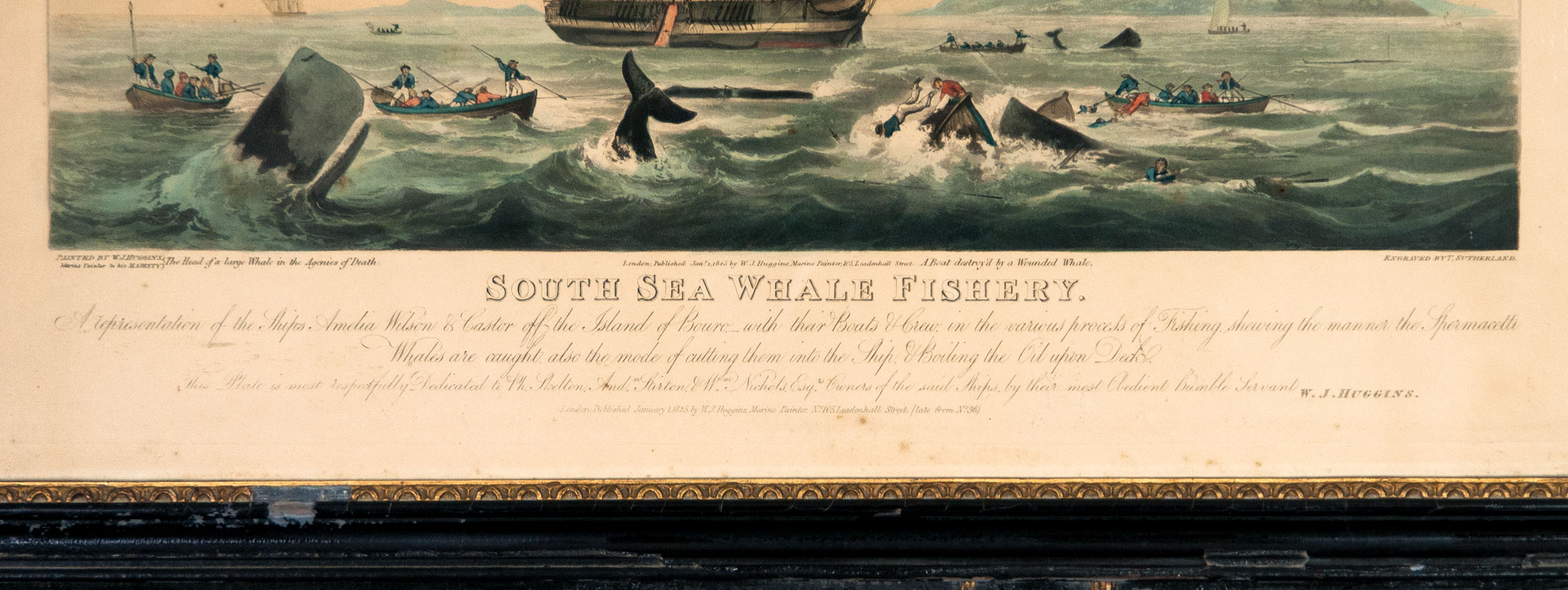 Hand colored engraving by W.J. Huggins (William John, UK, 1781-1845), of “South Sea Whale Fishery, A boat destroyed by a Wounded Whale.” off the island of Bouro, dated Jan 1, 1825, showing the “Amelia Wilson”, minor foxing and toning, (note: old tag on back “Property of Ames Loder, 144 Main St., Hingham, Mass”), found in an 18th c. house in Barnstable, MA that was scituated over the marsh, 18″ x 22 1/2″ (sight), 21 1/2″ x 25 1/2″ (frame), (ex. Dr. Oscar and Lois Hollander collection, Falmouth, MA).