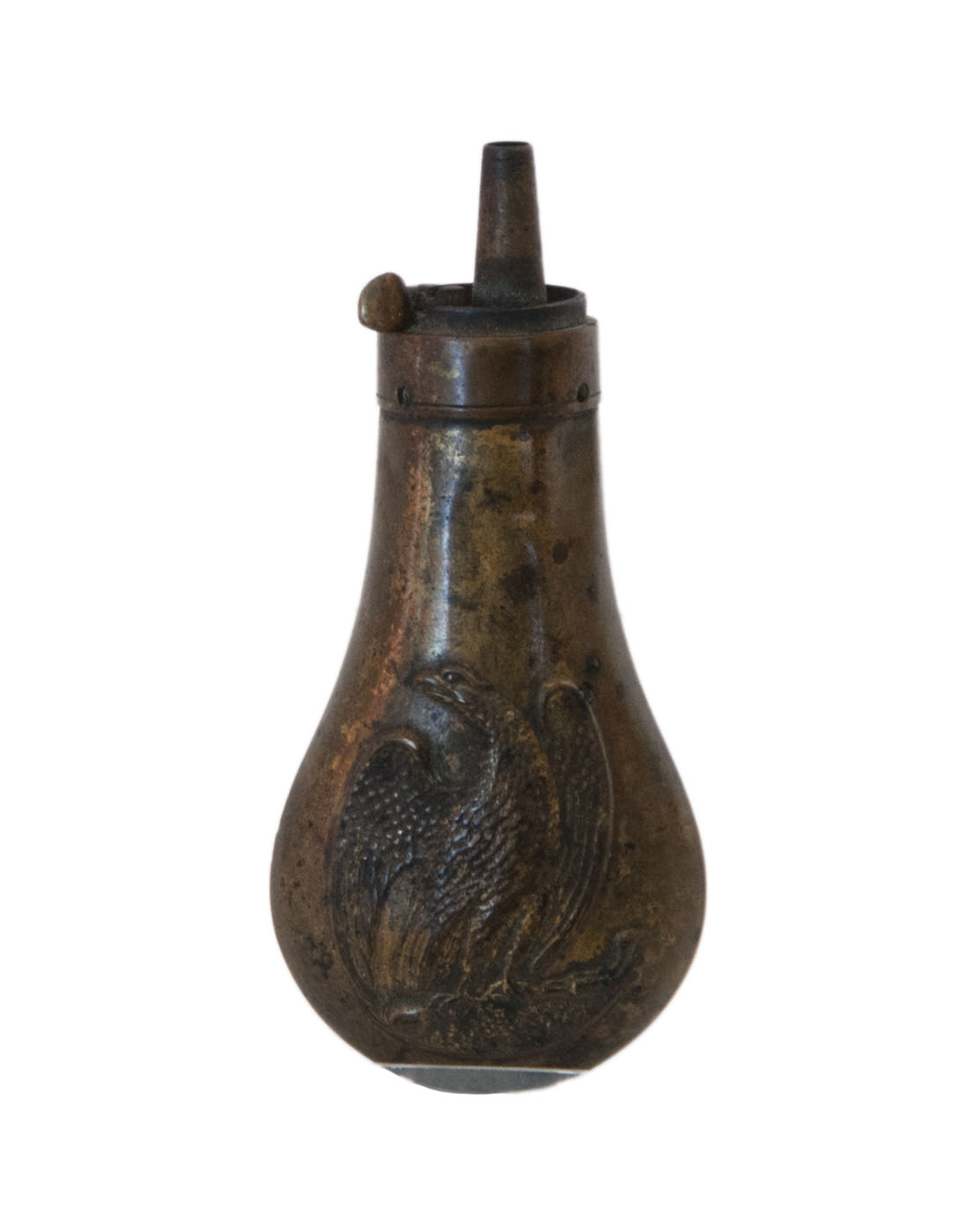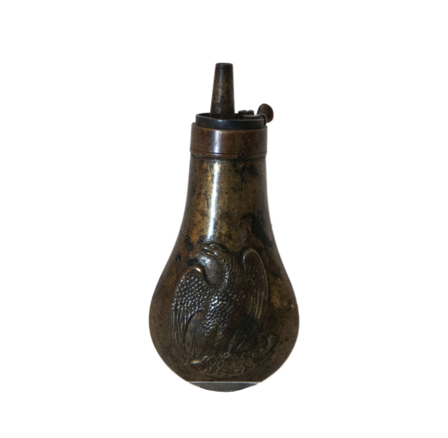 Brass, black powder primer flask, embossed on both sides with a Federalist eagle with a pistol in its talons, 4 1/2″ l, (ex. Dr. Oscar and Lois Hollander collection, Falmouth, MA).