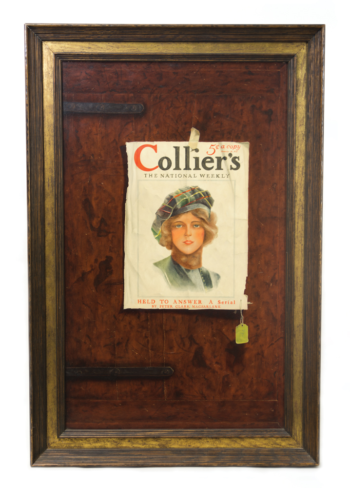 (American, 1947-), trompe l’oeil, c. 1977, titled “5¢ a Copy”, showing the cover of an early 20th c. Collier’s magazine taped to a wooden door with hand wrought strap hinges, artist signed l.l., in a gilt and dark stained oak frame, 31 3/4″ x 19 1/2″ (sight), 37 3/4″ x 25″ (frame).