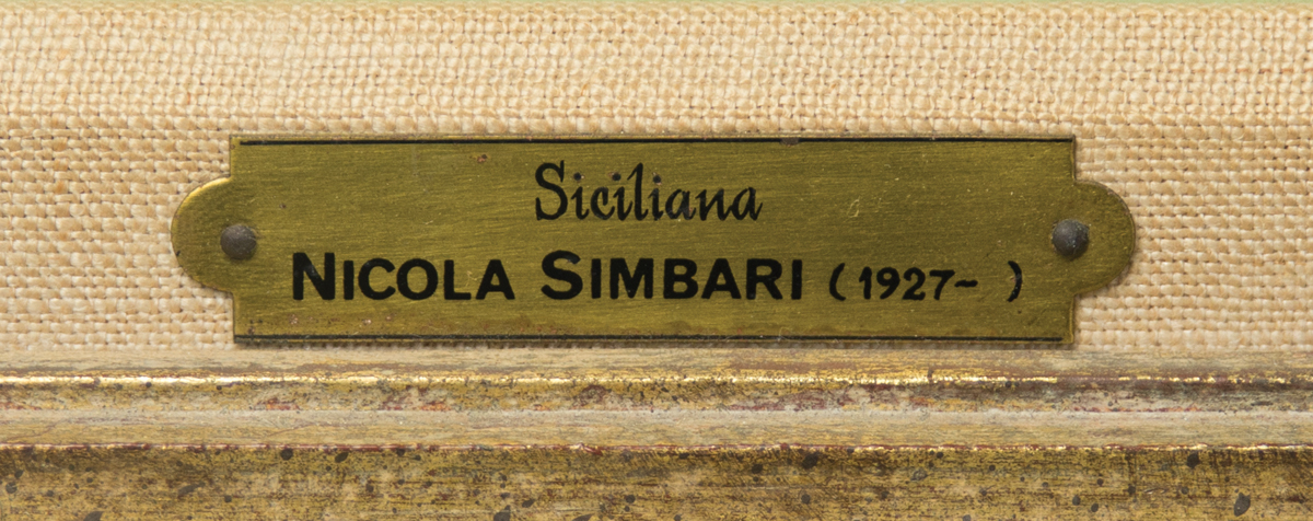 Titled “Siciliana”, rider on a burro, against a white wall, signed l.r. “Simbari, 66″ (1927-2012), carved and molded with gilt, interior mat, 19 5/8″ x 23 7/8″ (sight), 27 1/2″ x 31 1/2” (frame).