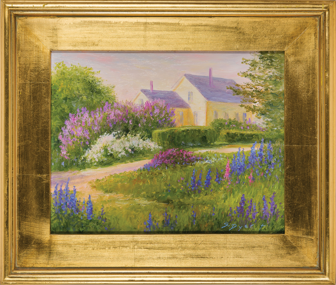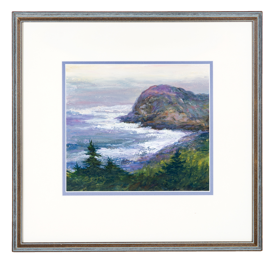 Both by Sylvia Dyer: “Fog Bank off Gull’s Head Rock, Monhegan”, acrylic on paper, 8 1/4″ x 9 1/4″ (sight); Oil on academy board, “Spring on Monhegan”, purchased in 2005 at Lupine Gallery, Monhegan Island, Maine, 11″ x 14″ (sight); from a Wellesley, MA estate.