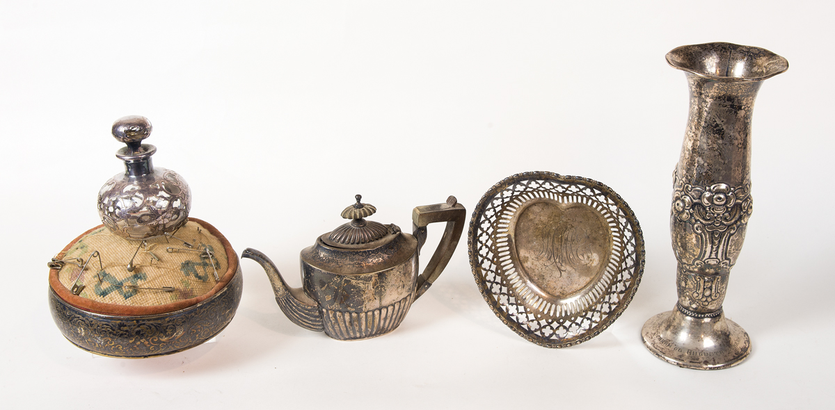 Perfume bottle, overlay on glass, vine pattern with flowers and initials, 4″ h; Pincushion, wrapped in circular silver casing (1 1/2″ h), with floral designs, 2 1/2″ h, 6″ dia; Small sterling teapot, “4789”, Federal style wooden handle and top, 5″ h, 7 1/2″ w; Heart shaped dish with reticulated design, “J.E. Caldwell & Co.”; Three small bowls – footed bowl, “P.S. Co.”, 2 3/4″ h, 5″ dia; “Black Starr & Frost”, 2 1/2″ h, 6 1/4″ dia; Tall floral decorated vase with petal top, engraved on back, 10″ h, 3 5/8″ dia; and Small Sheffield tray, 4 1/2″ dia; Approximately 30 oz t total weight; (ex. Milliken estate, Duxbury, MA).