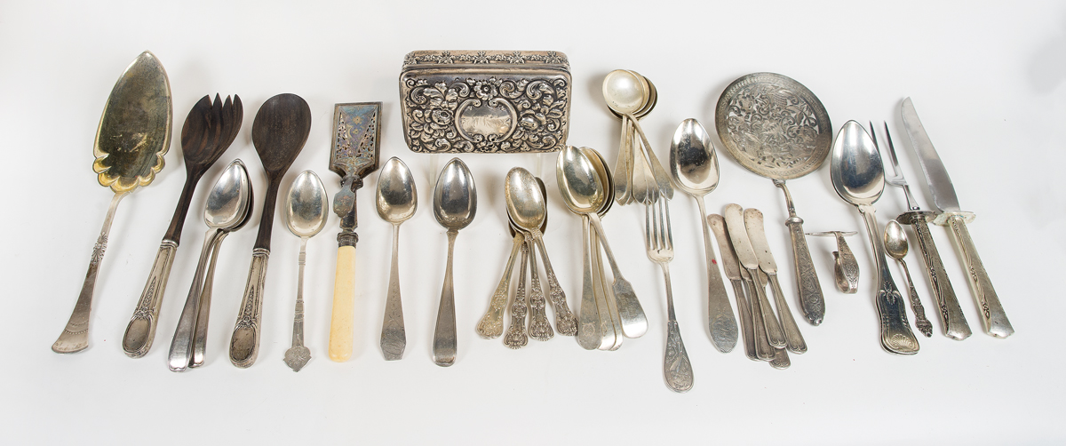 Lot 128: Silver Box, Serving Plates, Coin Flatware
