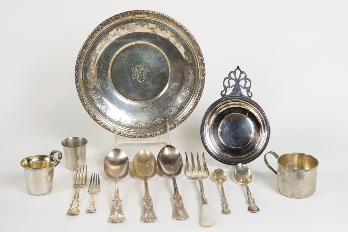 Including porringer, shallow bowl, baby cups, serving spoons and other flatware, approximately 22 oz t, from a Wellesley, MA estate.