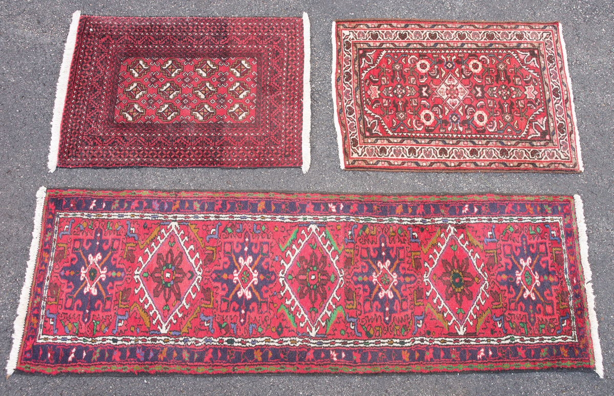 Balouche scatter rug, red field, good condition, 3′ 2″ x 2′ 2″; Hamadan scatter rug, red field, good condition, 3′ 1″ x 2′ 2″; Karajah runner, three diamonds, red and cobalt, 2′ 2″ x 6′ 7″.