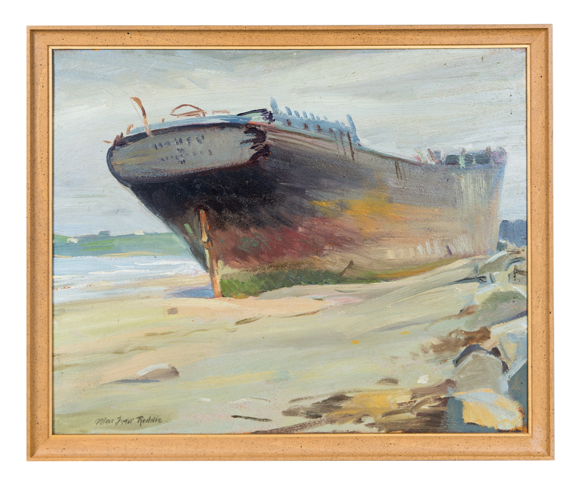 Oil on academy board, vessel aground on the beach, signed l.l. “MacIvor Reddie” (1899-1966), (note: said to be the Etrusco and beached in Scituate, MA), (from a Cohasset, MA estate of Charlotte Grisdale, friend of MacIvor Reddie and his wife Betty), 15 1/2″ x 19″.